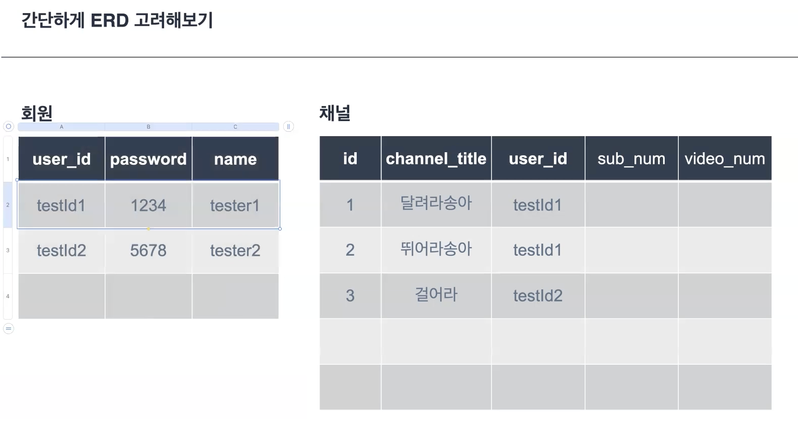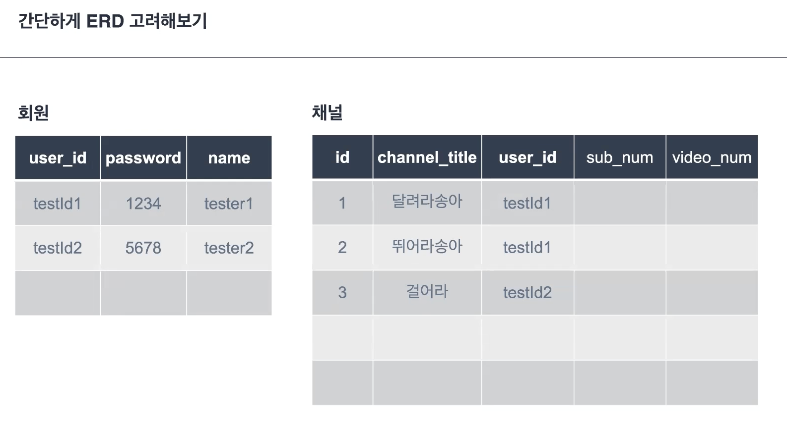 이전 유튜브 프로젝트에서 그린 ERD를 참고하여 사용자와 채널의 관계를 알아보자