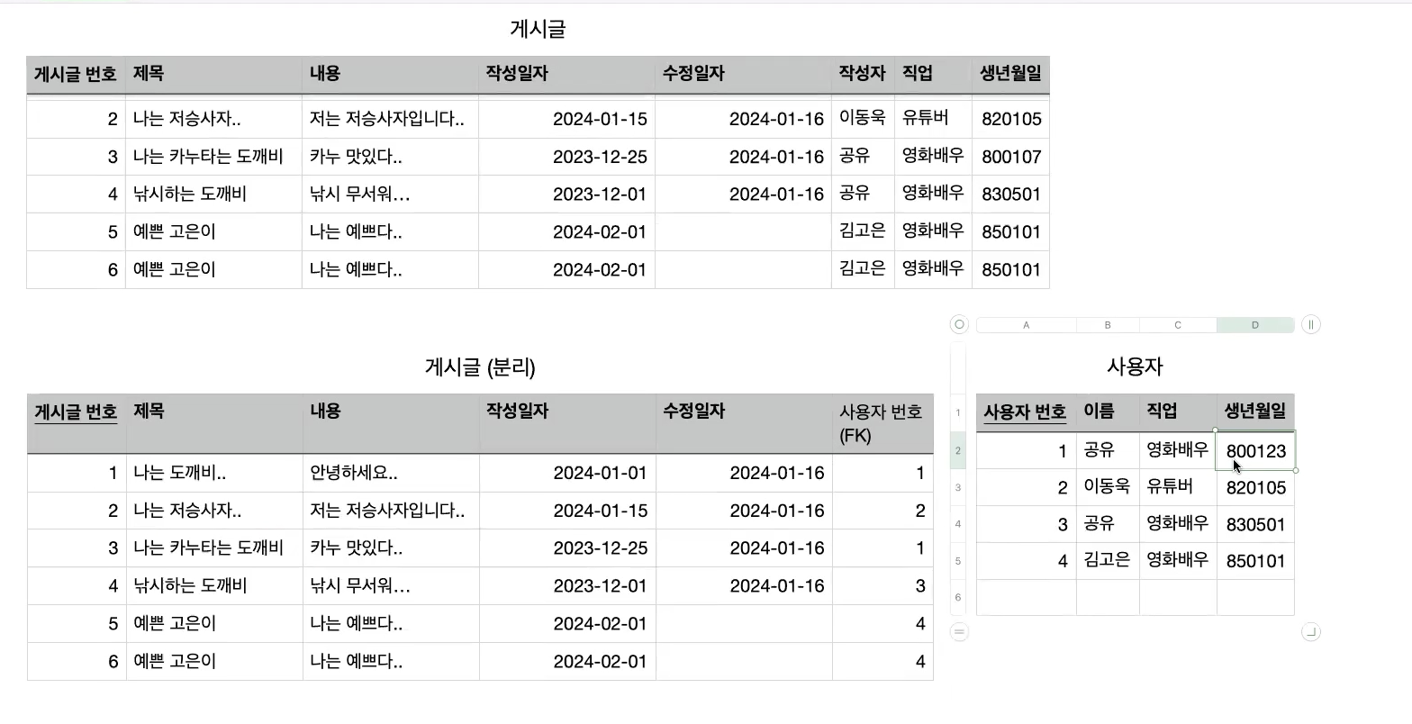 게시글과 사용자 테이블을 분리해주고 PK로 사용자 번호를 지정하자