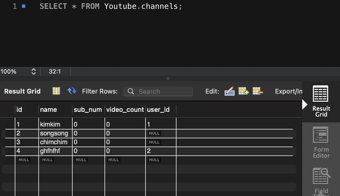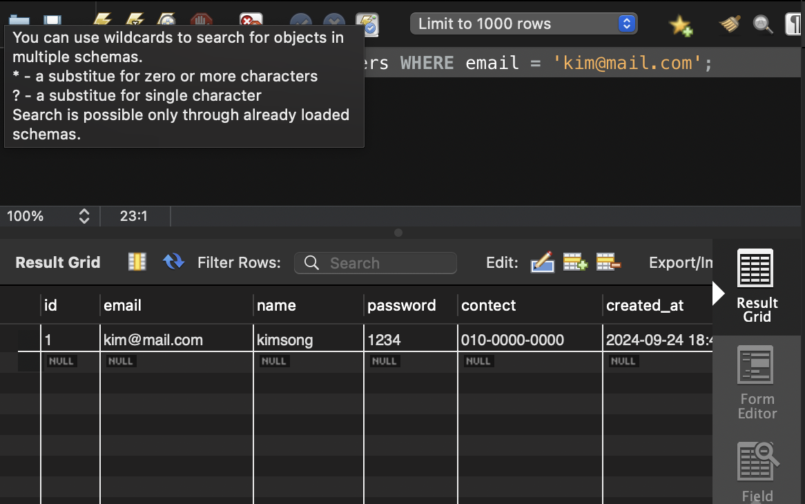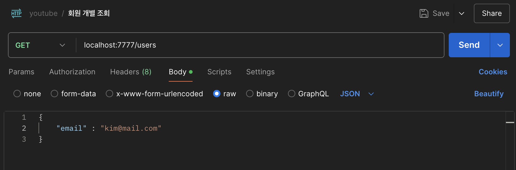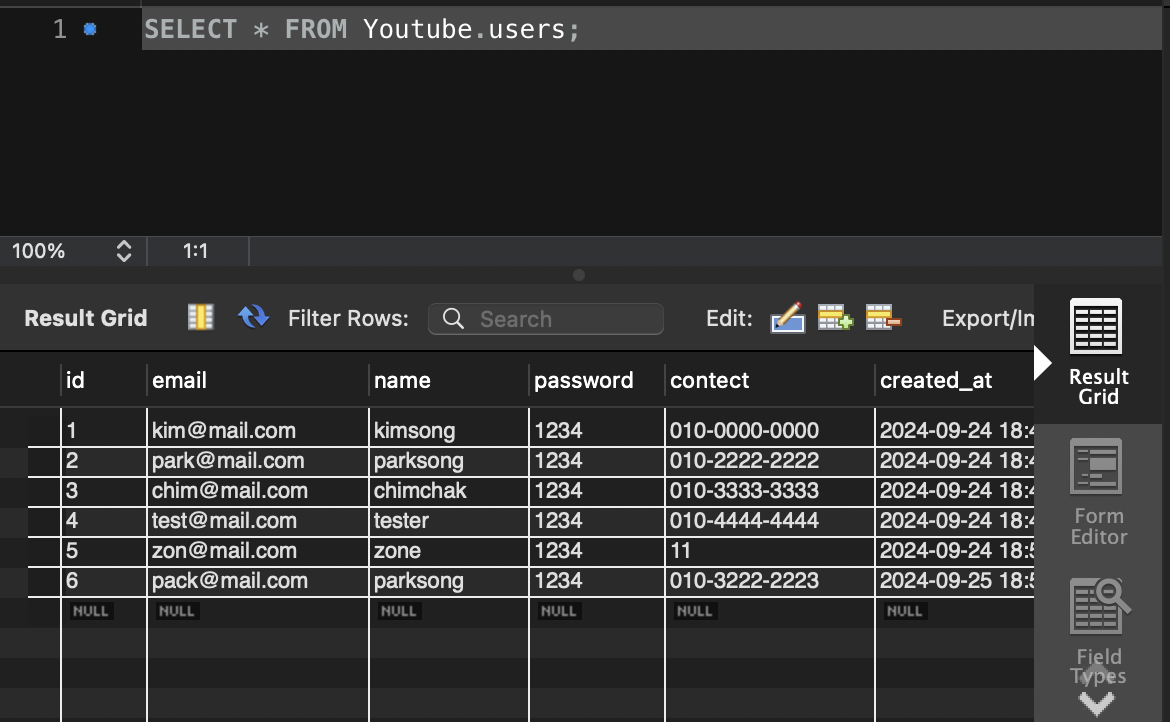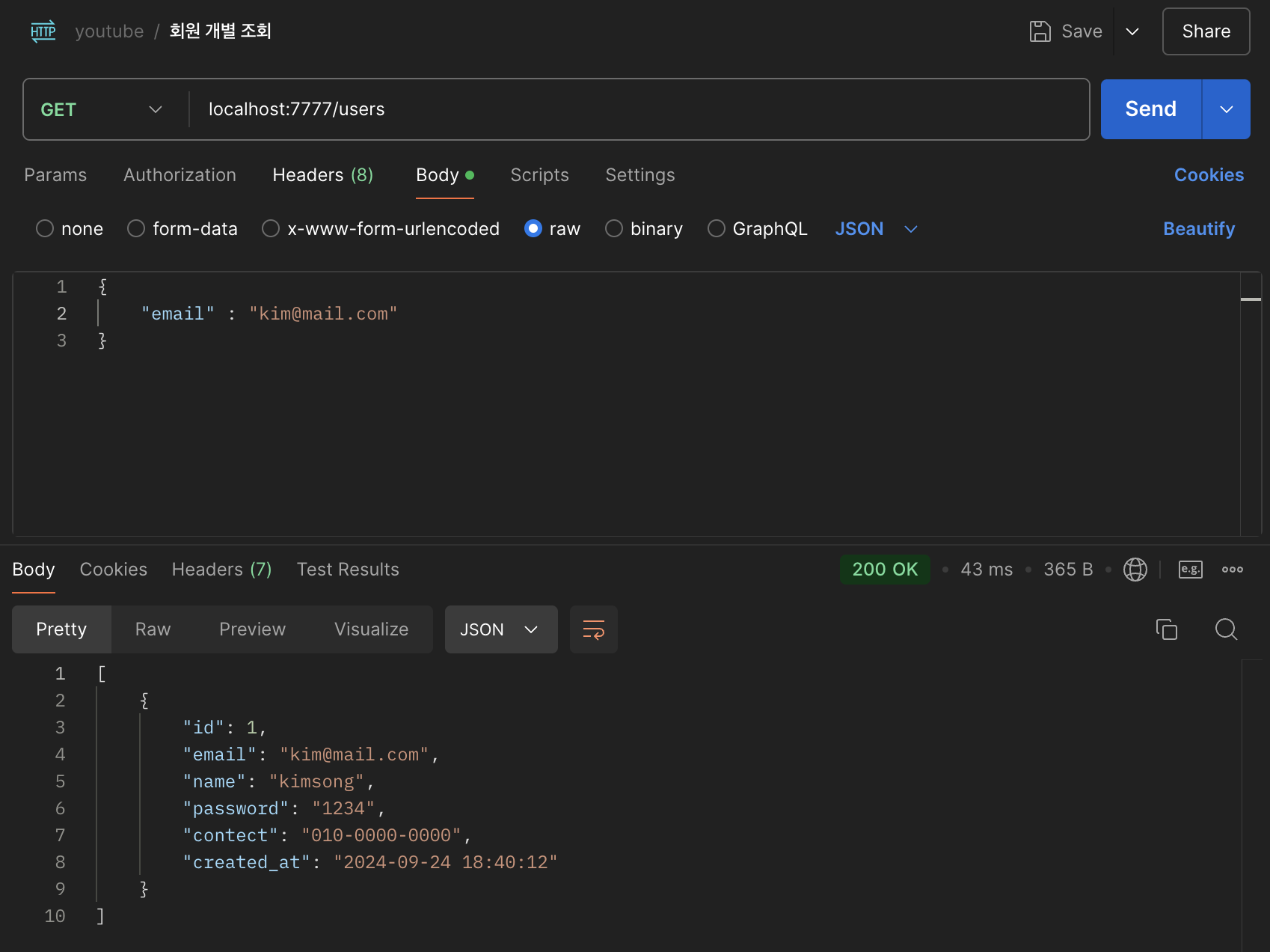 특정 이메일 조회 SELECT * FROM Youtube.users WHERE email = 'kim@mail.com';를 하는 것으로 회원정보 개별 조회를 해보자