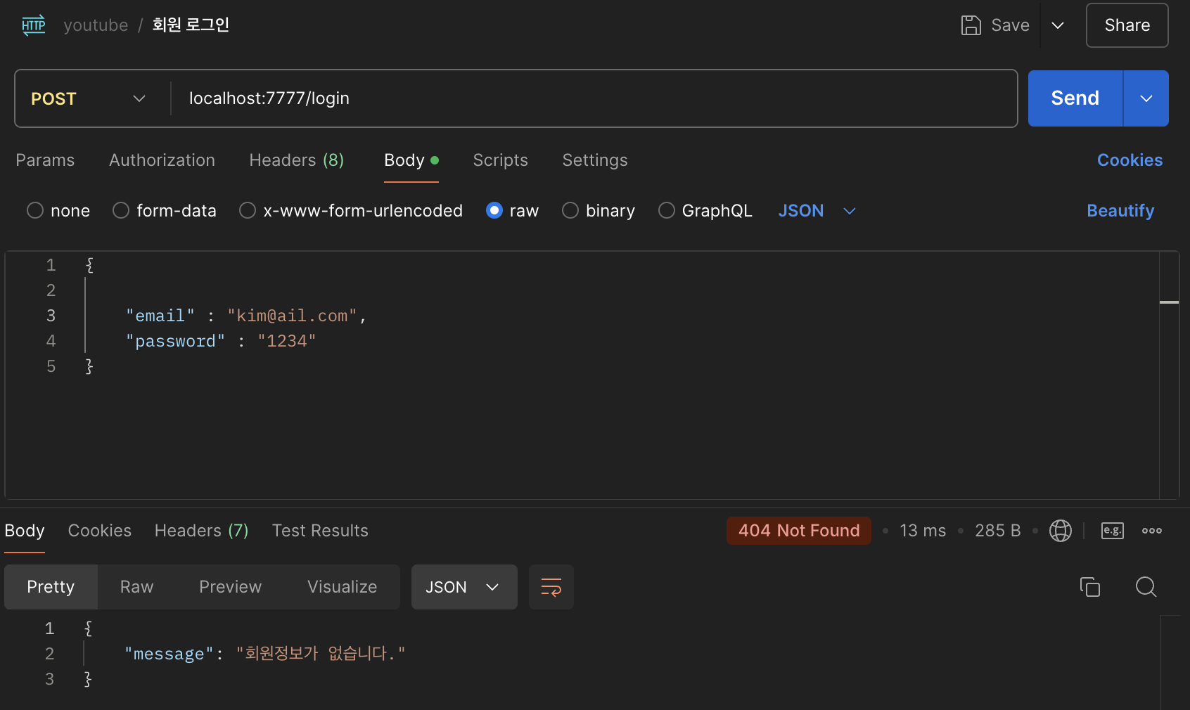 값을 잘 가져오는지 확인해보기 위해 body값에 이메일을 넣어 잘 반환하는지 확인해 보니 에러가 발생한다....