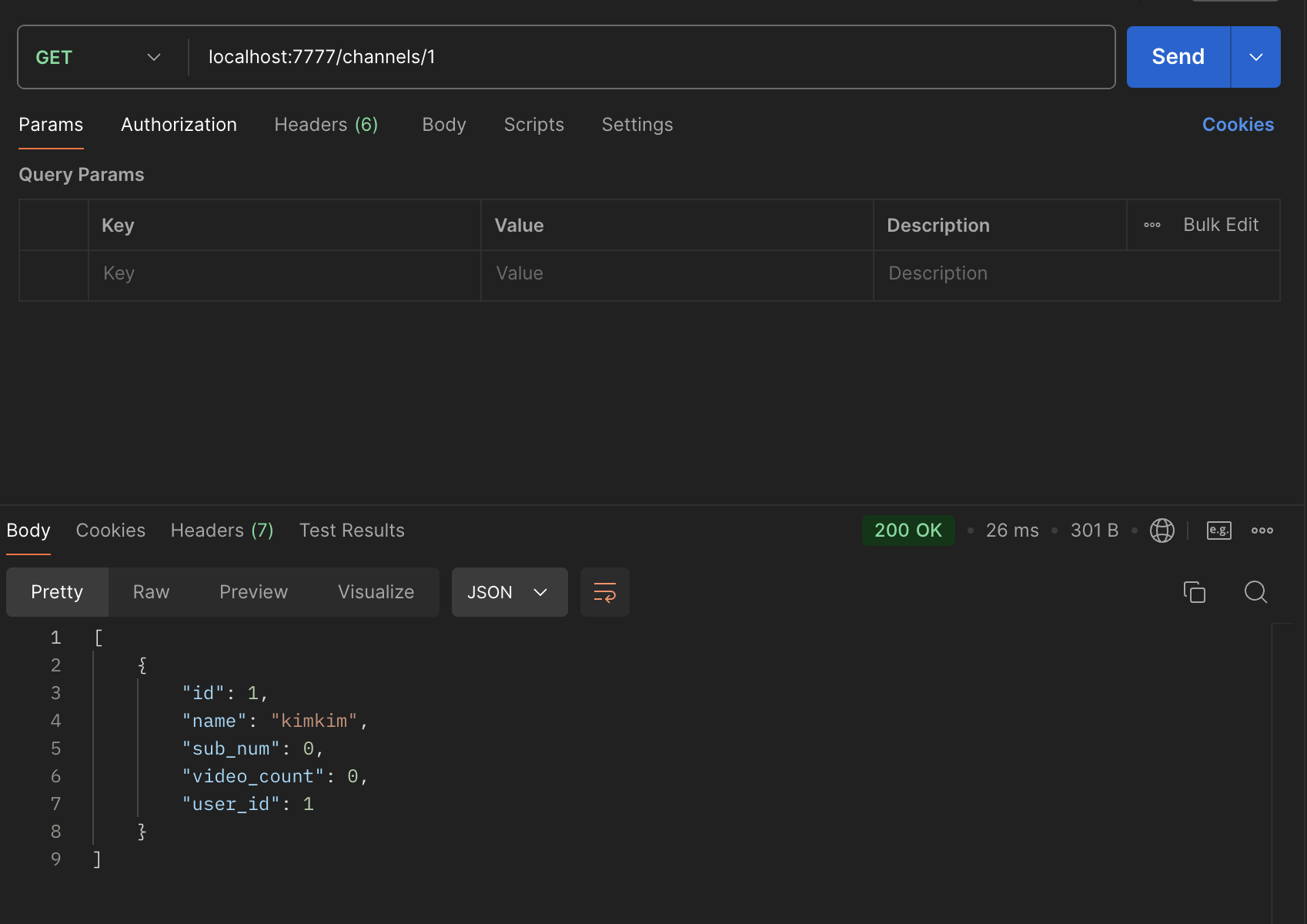 5) 채널 개별 "조회": GET/channels/:id (SQL문: SELECT)