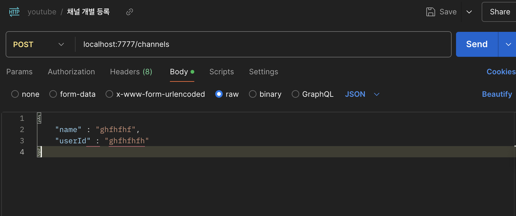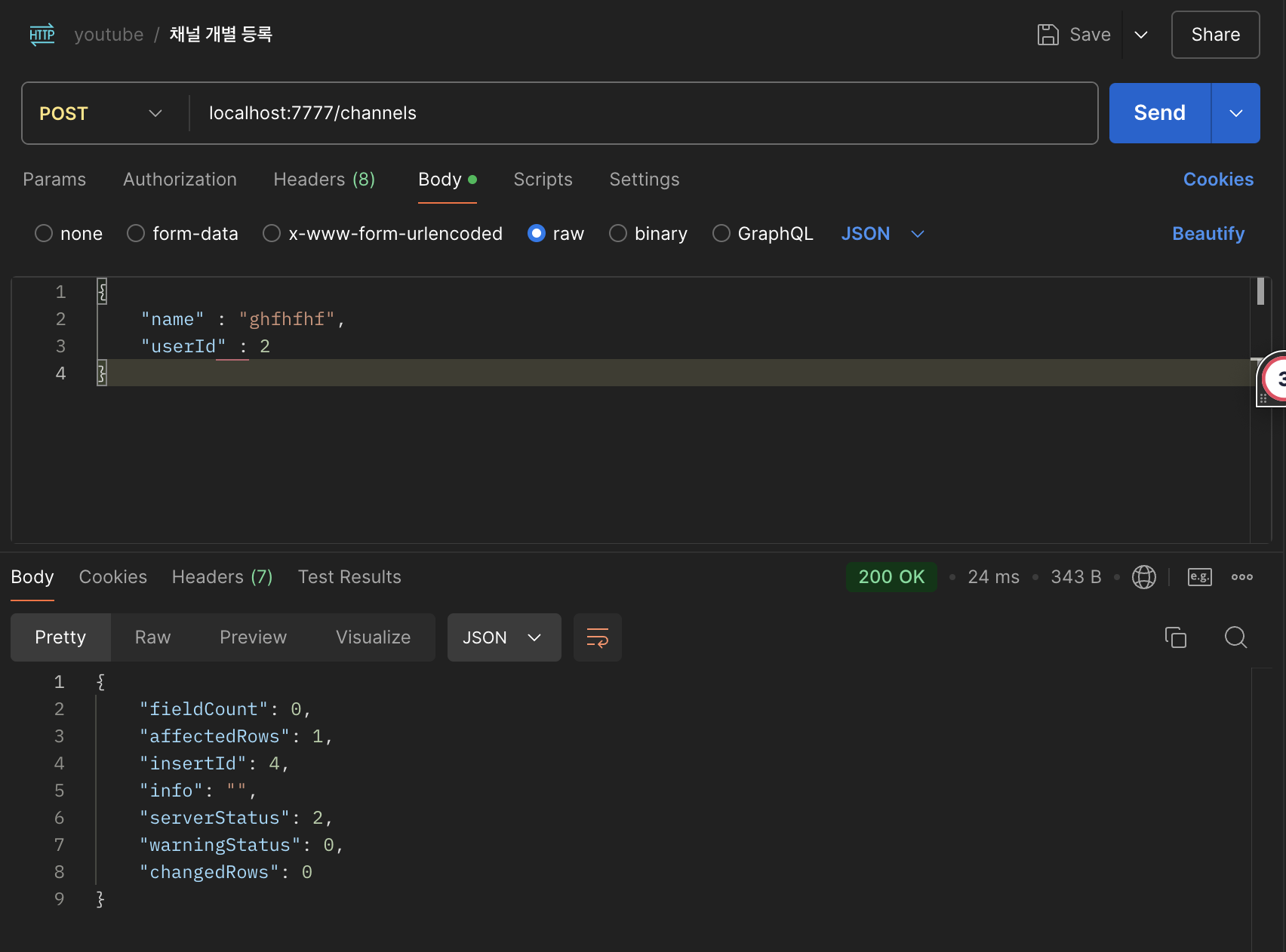 1) 채널 개별 "생성" : POST/channels (SQL문: INSERT)