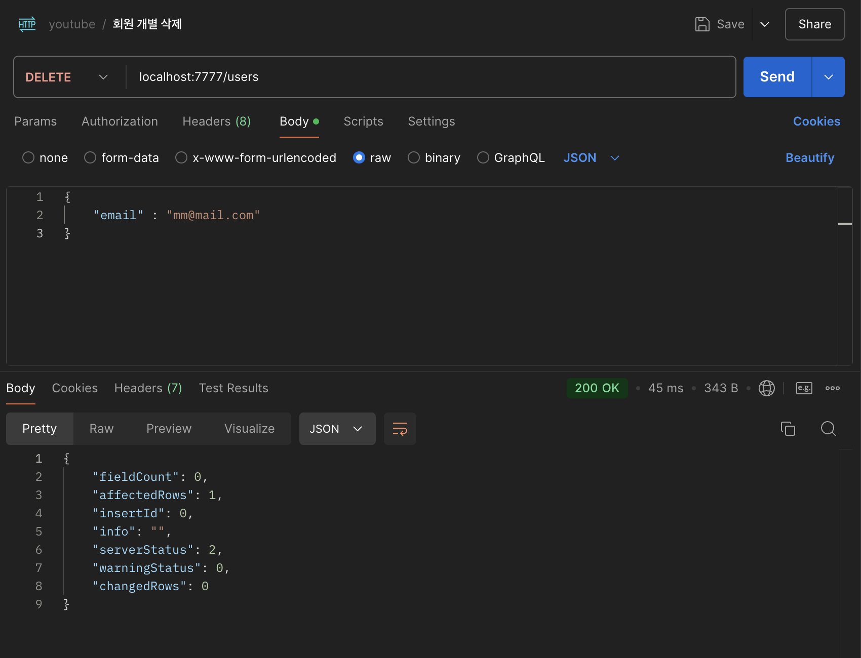 4) 회원 개별 탈퇴 : DELETE/users (SQL문: DELETE)