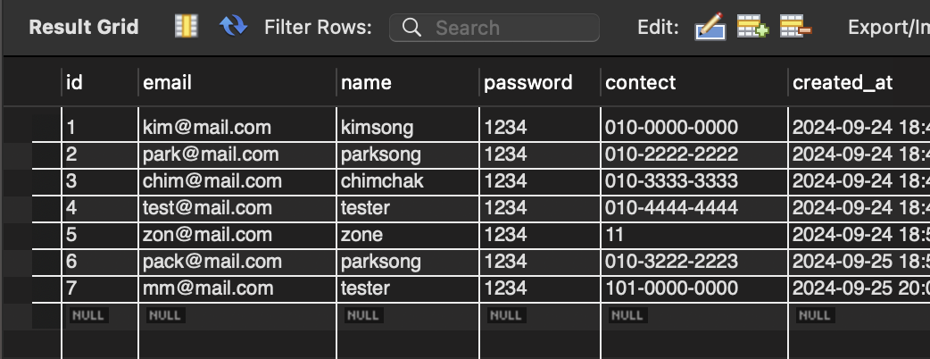 VALUES (?, ?, ?, ?)`, [email, name, password, contect], // SQL문으로 테이블에 등록을 해준다.