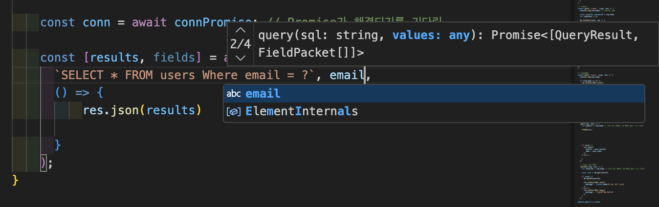 SELECT * FROM users Where email = ${email}로 이메일을 템플릿 문자열로 바꾼 것인데 이것이 원인일 수도 있을 거 같다.