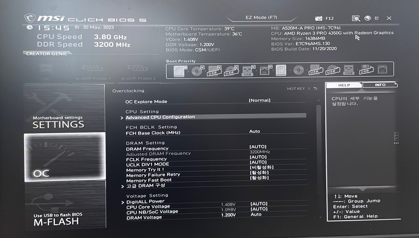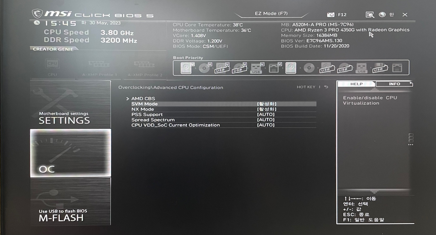 BIOS를 실행시켜서 SVM Mode 설정을 활성화로 변경해주었다