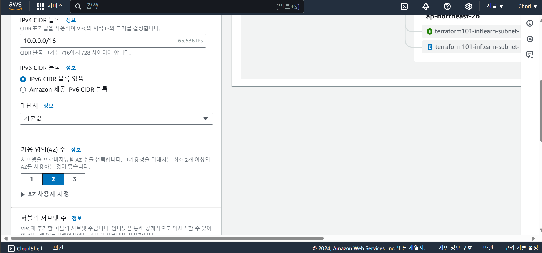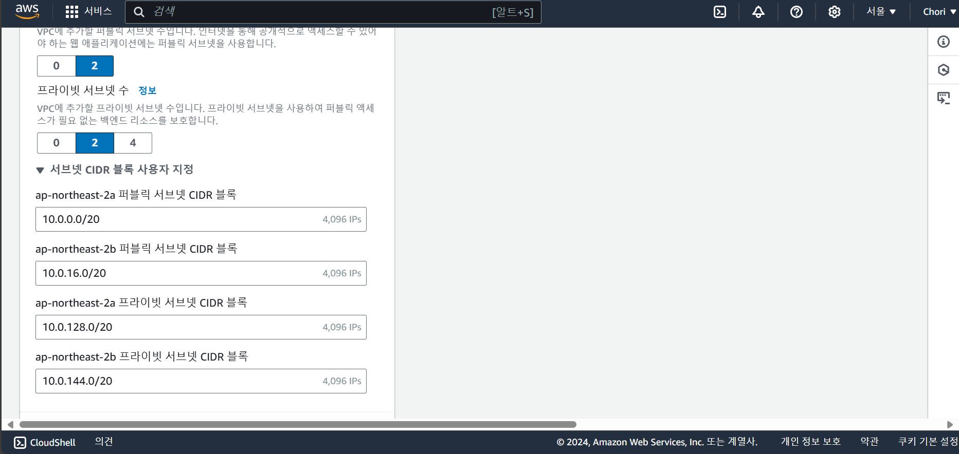 - CIDR 블록은 VPC 네트워크 망의 주소 범위를 의미