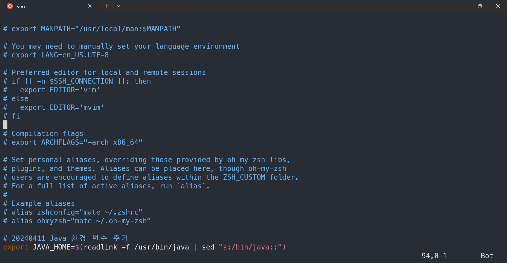 먼저 .zshrc 파일을 vim 편집기로 열겠습니다.
