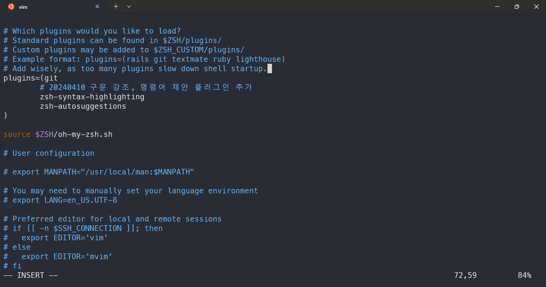 i를 눌러 vim을 입력 모드로 전환하고 73번째 행에 있는 plugins=(git)에 새로운 플러그인을 추가합니다.