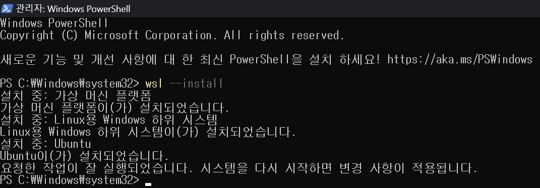 WSL과 Ubuntu 설치가 끝나면 컴퓨터를 재부팅합니다.