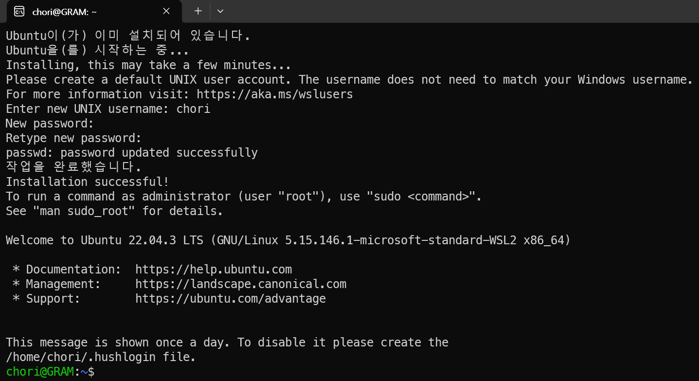 이렇게 WSL2와 Ubuntu 설치가 완료되었습니다!