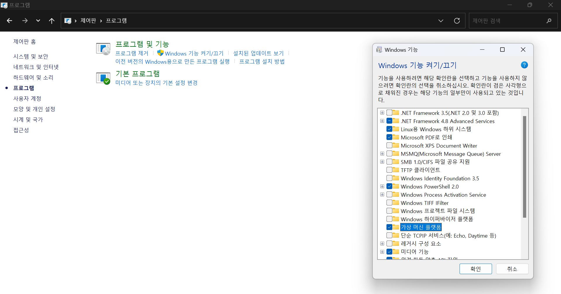 WSL과 Ubuntu를 설치했을 때 자동으로 관련 기능이 켜졌을 수도 있습니다. 혹여 자동으로 켜지지 않았다면 Linux용 Windows 하위 시스템과 가상 머신 플랫폼를 직접 활성화합니다.