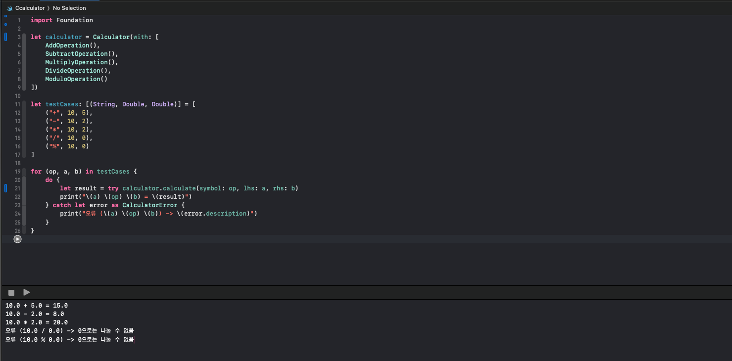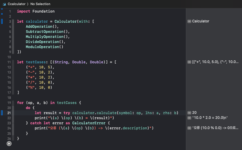 요주의 Calculator.swift, Operation.swift, CalculatorError.swift의 파일 안에 있는 코드들에 public을 붙여서 접근 가능하도록 구현해서 에러를 고치게 됨