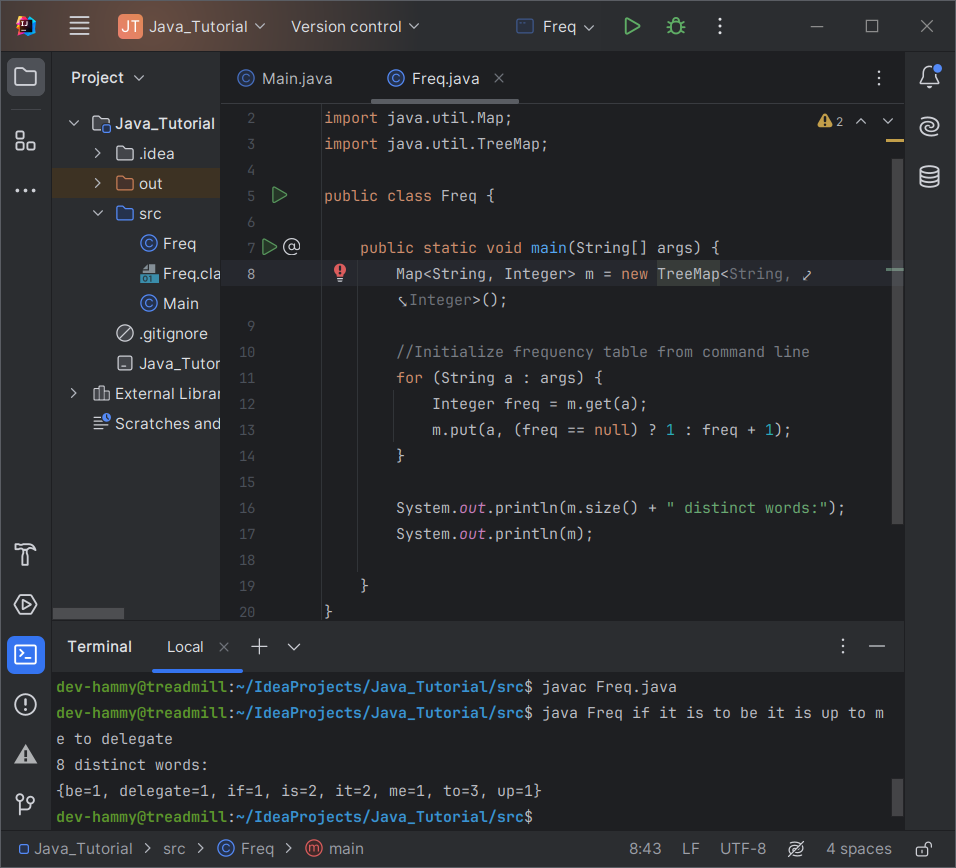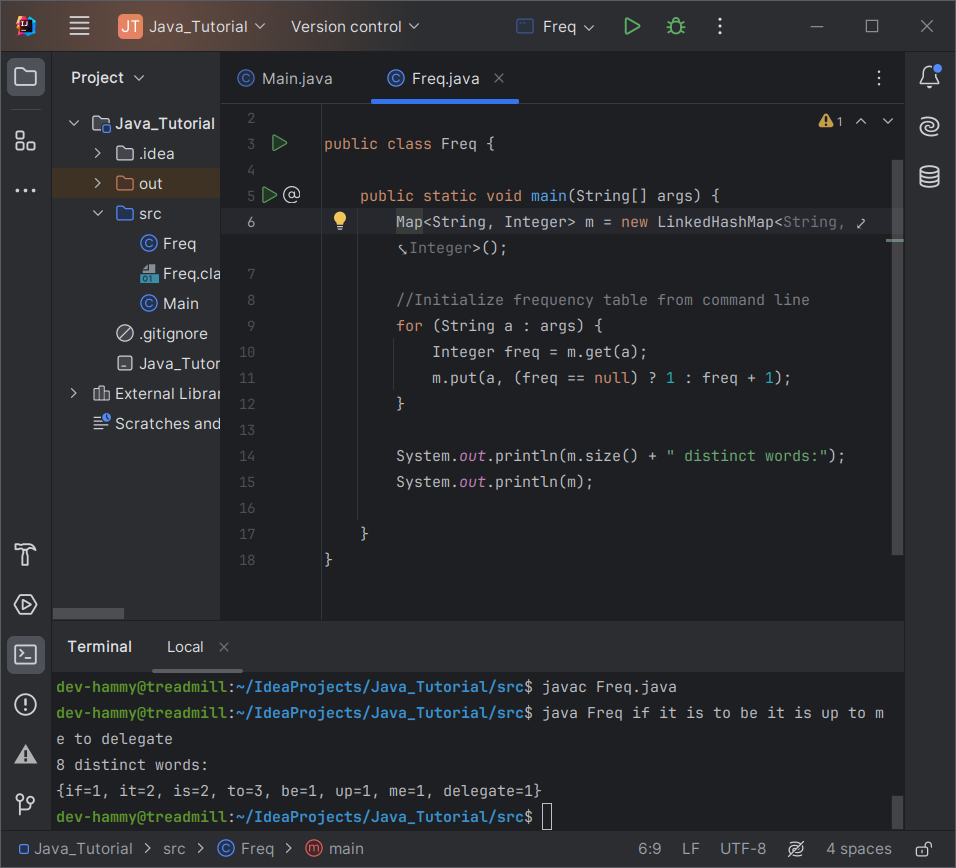 빈도표를 알파벳순으로 보고 싶다고 가정해 보겠습니다. 당신이 해야 할 일은 Map의 구현 유형을 HashMap에서 TreeMap으로 변경하는 것뿐입니다. 이렇게 4 글자를 변경하면 프로그램이 동일한 명령줄에서 다음 출력을 생성합니다.