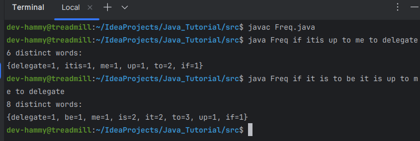 이 프로그램에서 유일하게 까다로운 점은 put 문의 두 번째 인수입니다. 해당 인수는 단어가 이전에 본 적이 없는 경우 빈도를 1로 설정하거나 단어가 이미 본 경우 현재 값보다 1 더 높게 설정하는 효과가 있는 조건식입니다. 다음 명령을 사용하여 이 프로그램을 실행해 보세요.