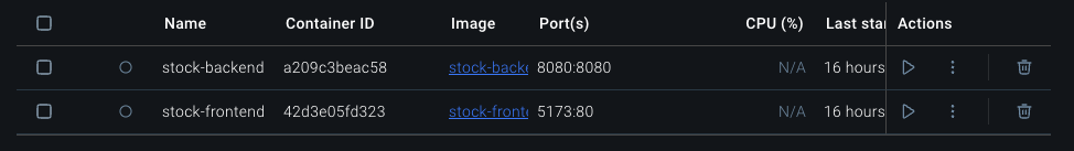 ac76e9fd4e78 java-backend "java -jar app.jar" 27 seconds ago Up 26 seconds 0.0.0.0:8080->8080/tcp stock-backend