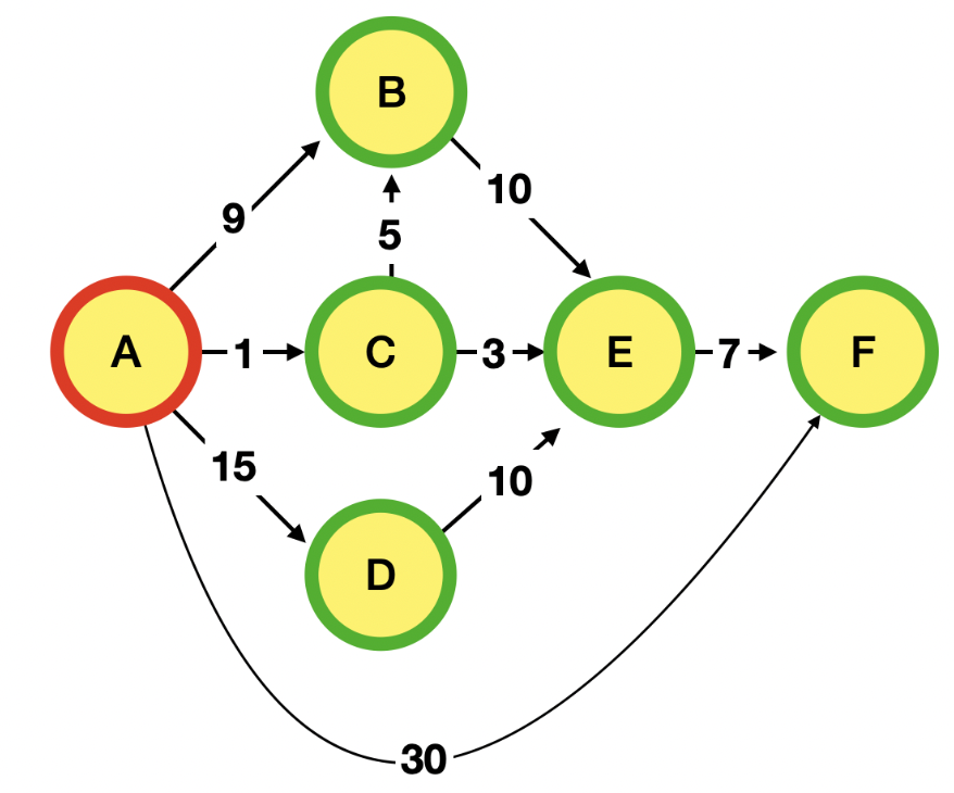 A에서 출발하여 F까지 가는 최단 거리를 찾는다.