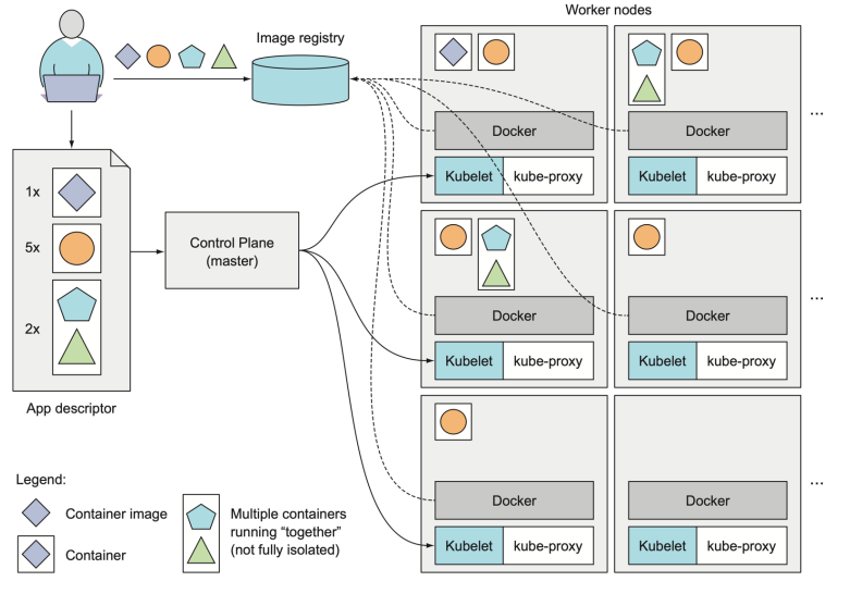 그리고 해당 spec을 유지하기 위해 master node는 woker node와 소통하면서 pod들을 할당한다. 그리고 각자의 pod들은 본인의 container들을 가져다가 실행한다. 여기서 pod안에는 하나의 container가 있을수도 있지만 multi-container가 있을수도 있다.