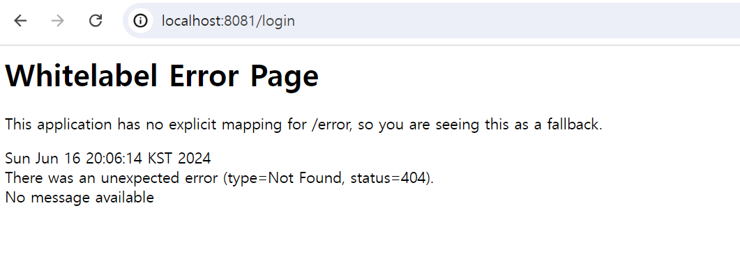 위와 같이 404 Not Found가 발생하는데 이는 클라이언트 화면을 만들지 않았기에 정상적인 Error Message 이다.