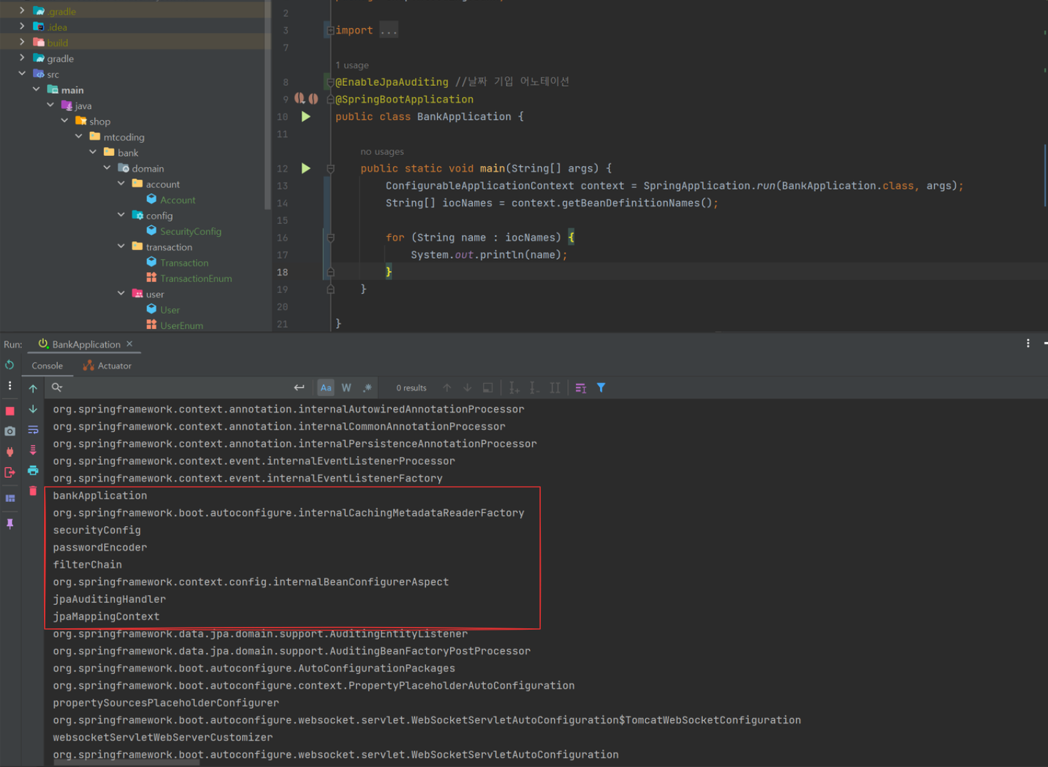 Bean이 정상적으로 작동 되는지 확인하기 위해 Main Class 에 위와 같이 수정 한 후 실행 한다.