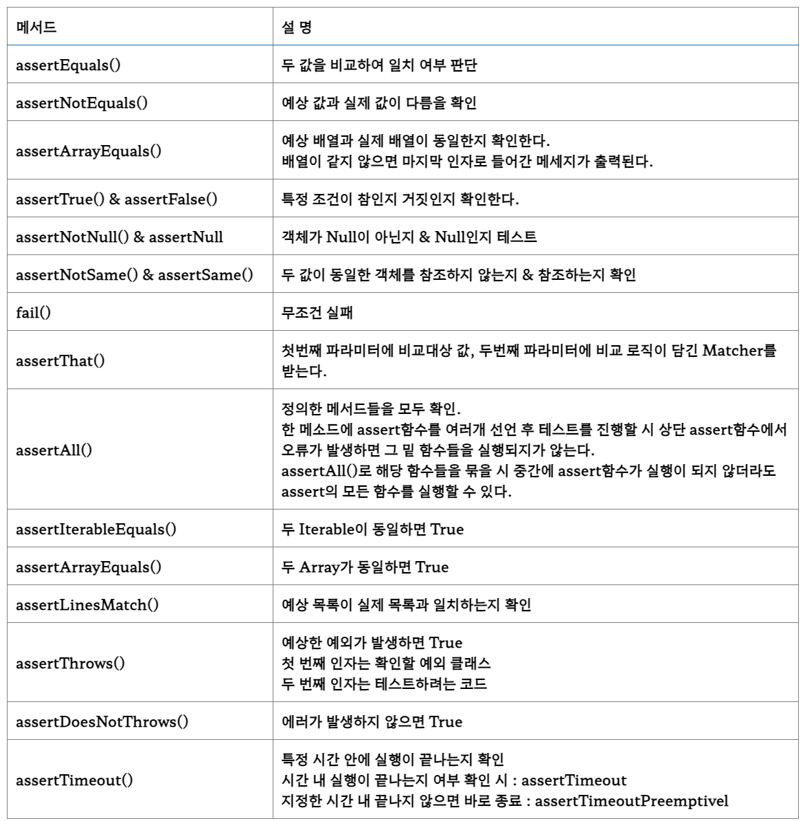 테스트 케이스의 수행 결과를 판별하는 메서드 이며 모든 Junit Jupiter Assertions는 static 메서드 이다.