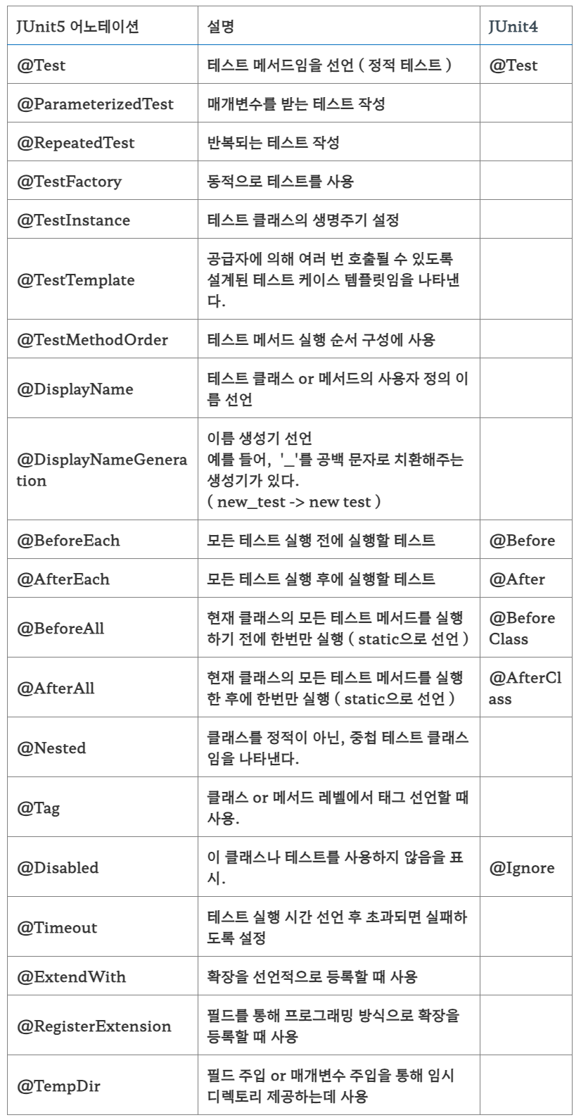 SpringBoot 2.2.0 이전에는 JUnit4가 기본으로 설정되었지만, 2.2.0버전 부터는 JUnit5가 기본으로 설정 된다고 한다.