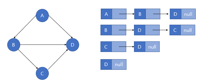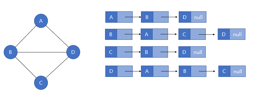 - 각각의 정점을 head로 시작해서 인접한 노드들을 전부 연결리스트로 연결