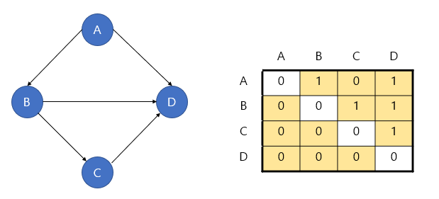 - 자기 자신으로 연결되는 self loop가 없으므로 배열의 대각선은 모두 0