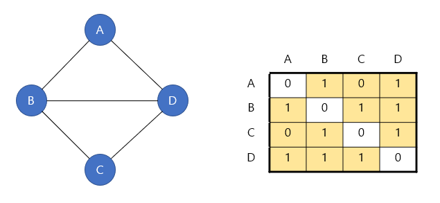- A->B가 연결되어 있다면 B->A도 연결되어 있기 떄문에 무방향 그래프를 인접 행렬로 구현하면 대각선을 기준으로 대칭이 된다.
