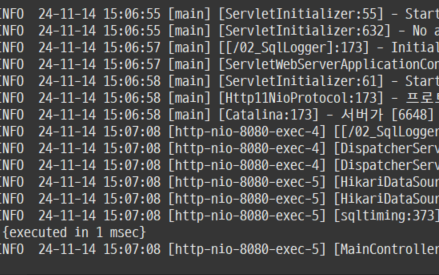 Connection opened : 커넥션 연결 (기본 설정이 10개라서 10개가 나온다.)INFO 24-11-14 14:18:45 [sqltiming:373] - SELECT * FROM bbs ORDER BY idx DESC {executed in 3 msec} : 쿼리문 + 실행 시간Total: 734 : 총 행 수Completed 200 OK : 상태C드라이브에 logs 라는 폴더에 server.log 파일을 확인하면 로그를 확인할 수 있다.