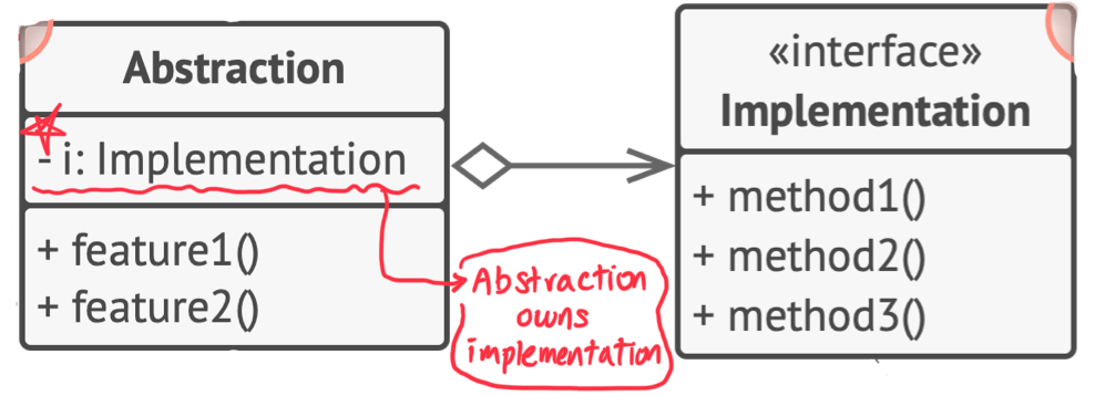 추상부와 구현부 계층이 나뉘어져 있다. 추상부는 클래스로, 구현부는 인터페이스로 되어있다. 추상부는 구현부를 프로퍼티로 가지고 있으며, 그림엔 없지만 feature1()과 feature2() 메서드는 구현부에 접근해서 메서드를 호출한다.