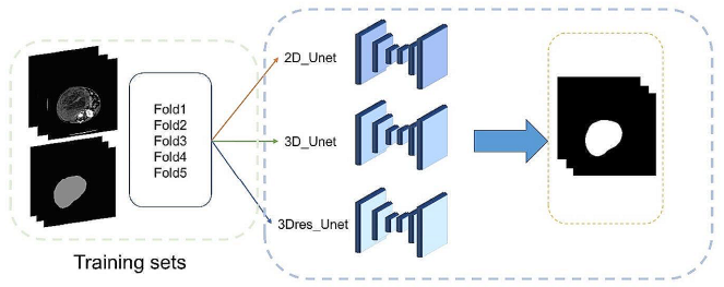 U-net 기반 적응형 분할 프레임워크인 nnU-Net을 자동 종양 분할에 사용했다. 2D Unet, 3D Unet, 3Dres Unet(U-Net Cascade)의 세 가지 모델이 훈련 세트 데이터를 사용하여 훈련되었다. 환자 데이터를 완전히 활용하기 위해 5-fold cross-validation이 훈련 과정에 적용되었다. training 후, 세 모델의 출력이 쌍으로 결합되었고 가장 좋은 모델이 테스트 이미지 세트에서 검증되었다.