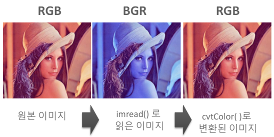 cvtColor(이미지 배열, cv2.COLOR_BGR2RGB)를 이용하여 BGR을 RGB로 변환