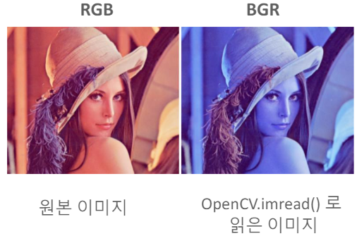 OpenCV에서 이미지 로딩은 imread('파일명')을 이용. imread('파일명')은 파일을 읽어 넘파이 array로 변환 -> (x, y, z) 세로,가로,채널