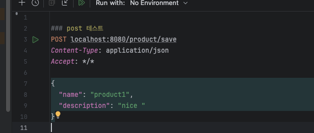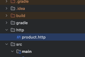 사진과 같이 src/와 동일한 경로에 http/에 파일을 만들면 됩니다. 만약 http/가 없다면 만들어서 사용하고 굳이 product.http 이름은 동일할 필요가 없습니다.