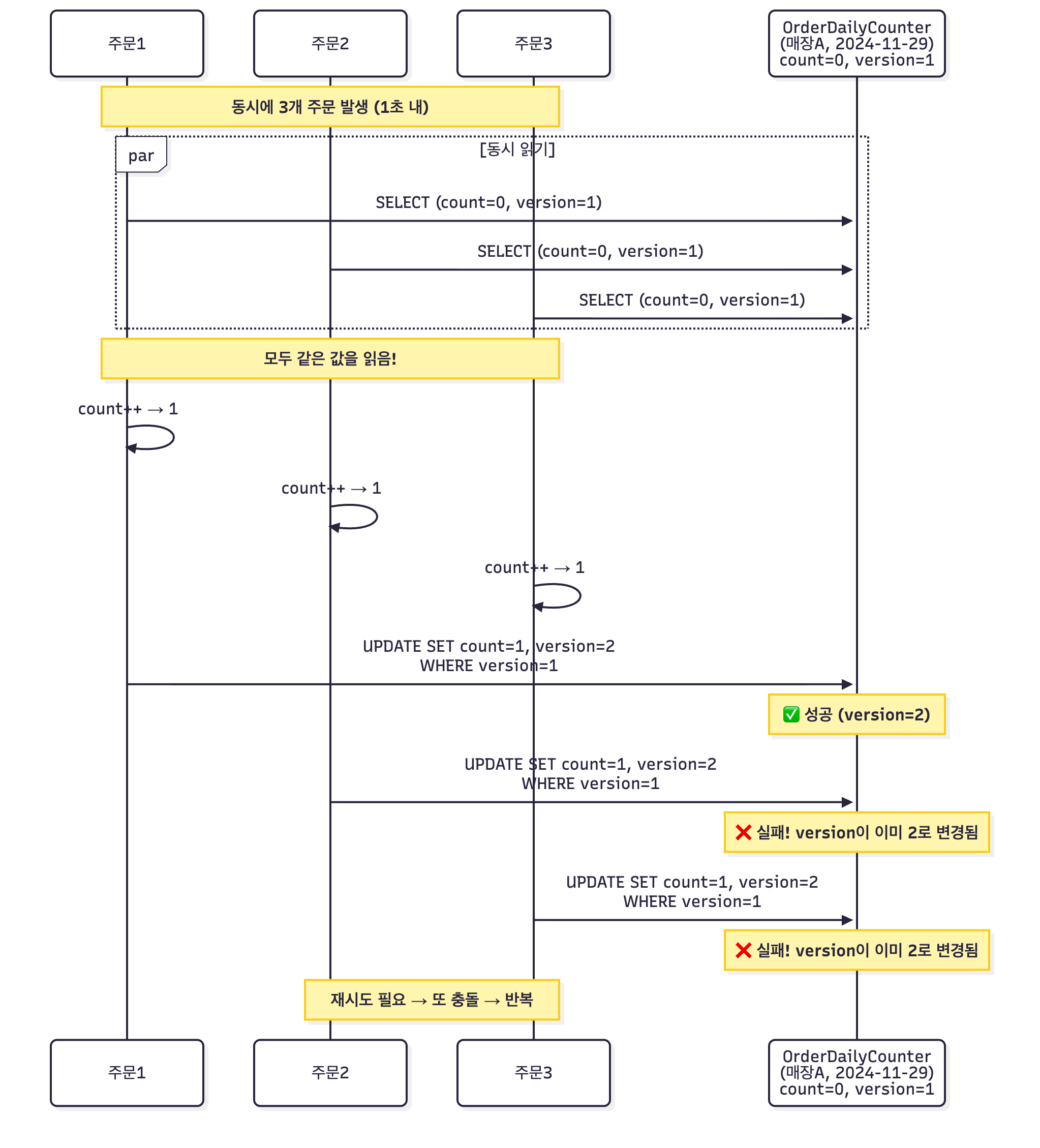 기존 테스트는 모든 주문이 1개에 매장으로 향한다. 이 경우 동시성 이슈가 있던 주문번호 생성 로직은 100% 충돌이 발생한다. 매장은 주문번호 생성을 위해서 주문이 들어오면 counter +1을 한 값을 주문번호로 만든다. 이때 동시에 요청이 들어오면 충돌이 발생했고 비관적 락은 충돌을 일어나는 것을 전제로 만든 로직이었고 낙관적 락은 그렇지 않았던게 문제 였다.