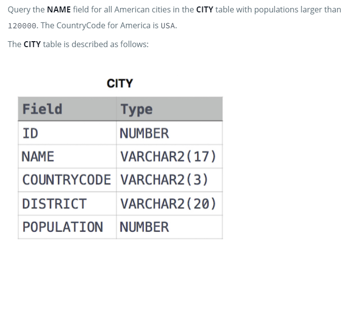CITY 테이블에 있는 인구 120,000명 이상의 모든 미국 도시에 대한 NAME 필드를 쿼리합니다. 미국의 국가 코드는 USA 입니다.