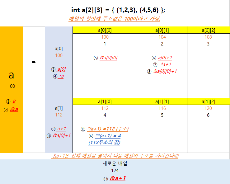 printf("%p\n", a+1); // โจ ์ฒซ ๋ฒ์งธ ํ ๋ค์์ ํ a[2], ์ฆ ๋ ๋ฒ์งธ ํ์ ์ฃผ์๋ฅผ ๊ฐ๋ฆฌํด 112