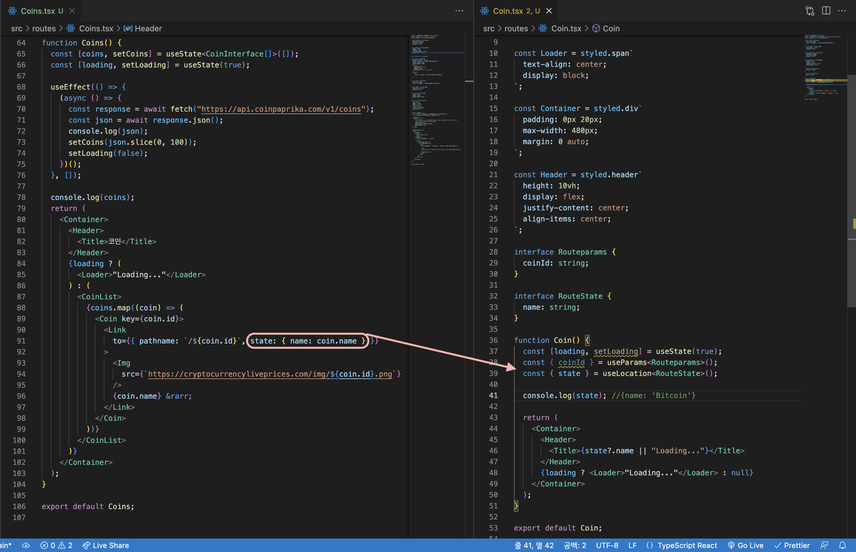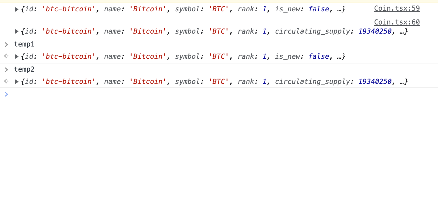 하지만 코인 상세 페이지에선 chart를 렌더링하고 있고 URL로부터 이미 coinId값을 가지고 있기 때문에 코인 상세 페이지에서 props를 보내는 방법을 쓸 수 있음.