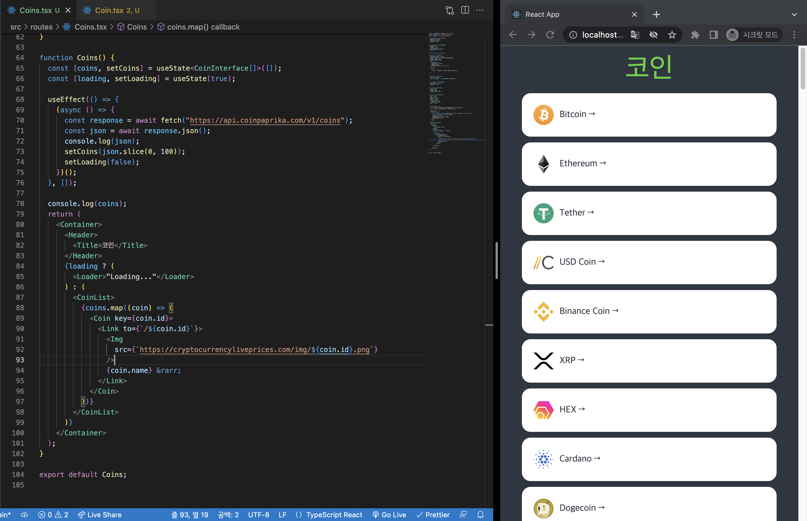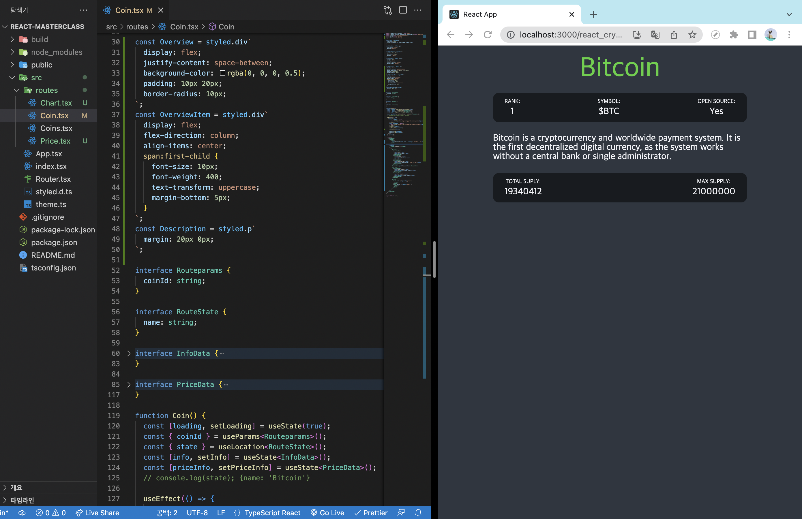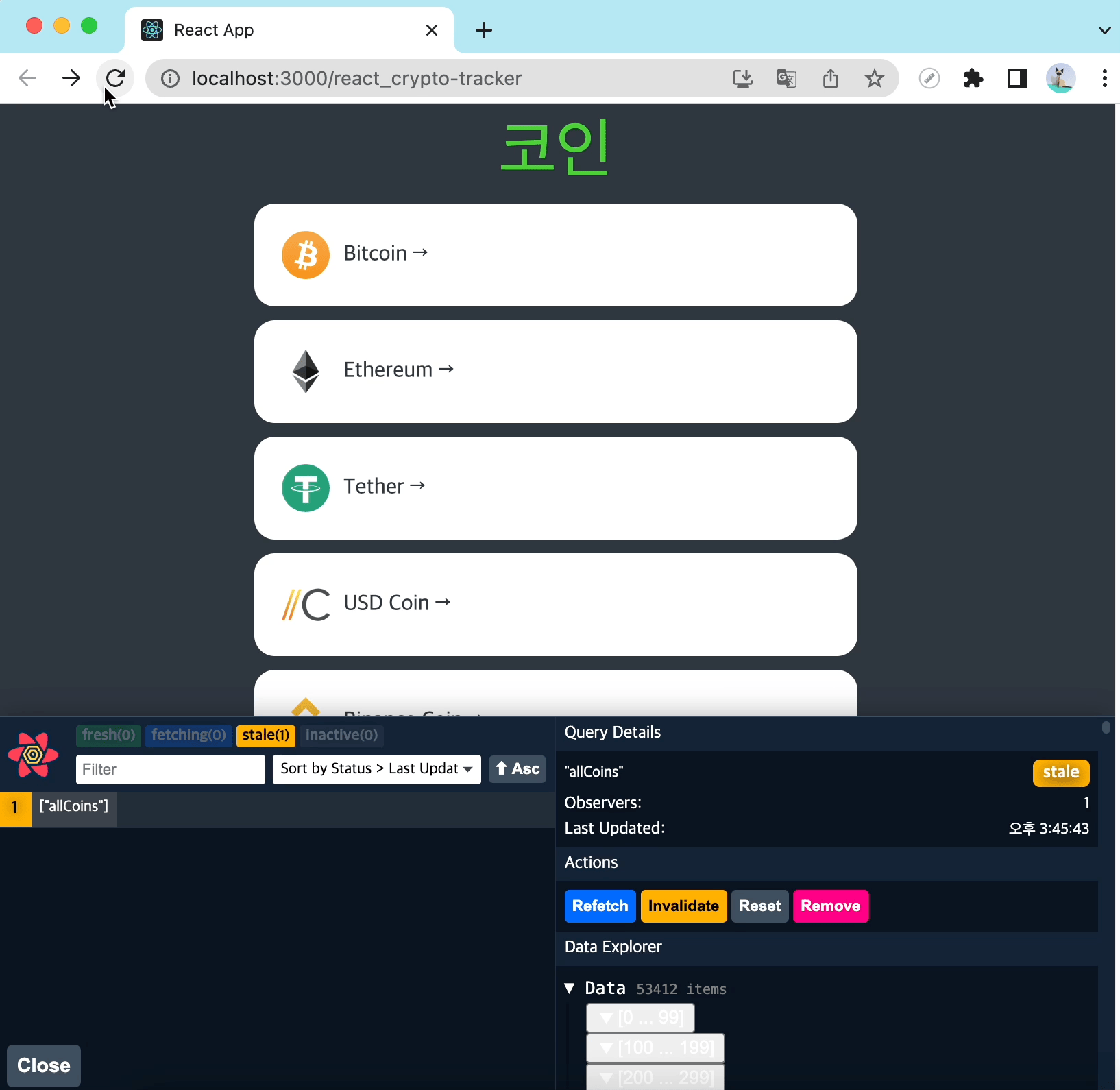 이번 섹션에서는 지금까지 배운 TS,스타일 컴포넌트, 리액트의 Router Dom을 이용하며 평범하게 데이터를 fetching 한다음 react-query로 바꾸는 연습도 하면서 간단한 코인 트래킹 어플리케이션을 만들어 볼거임.