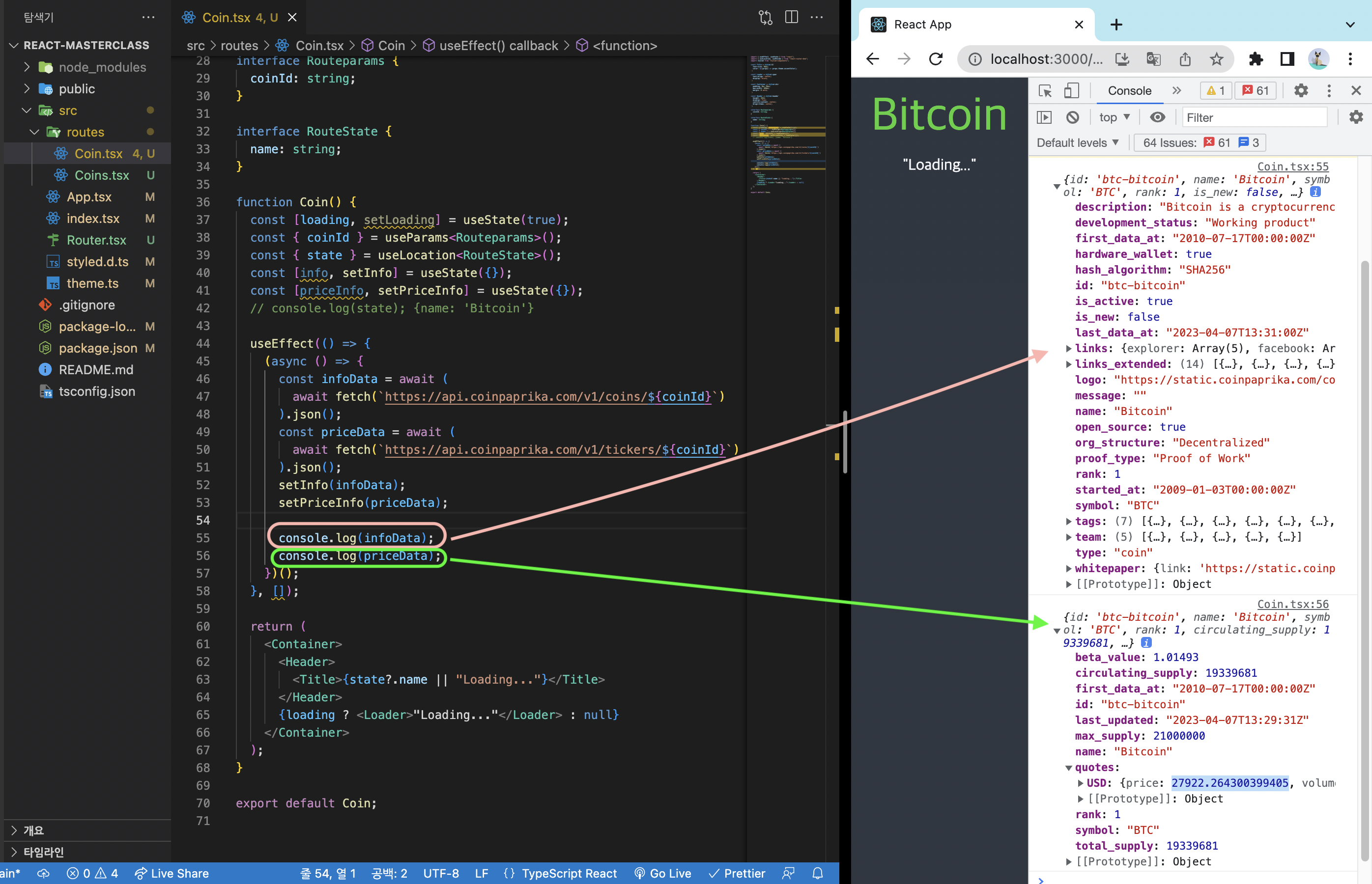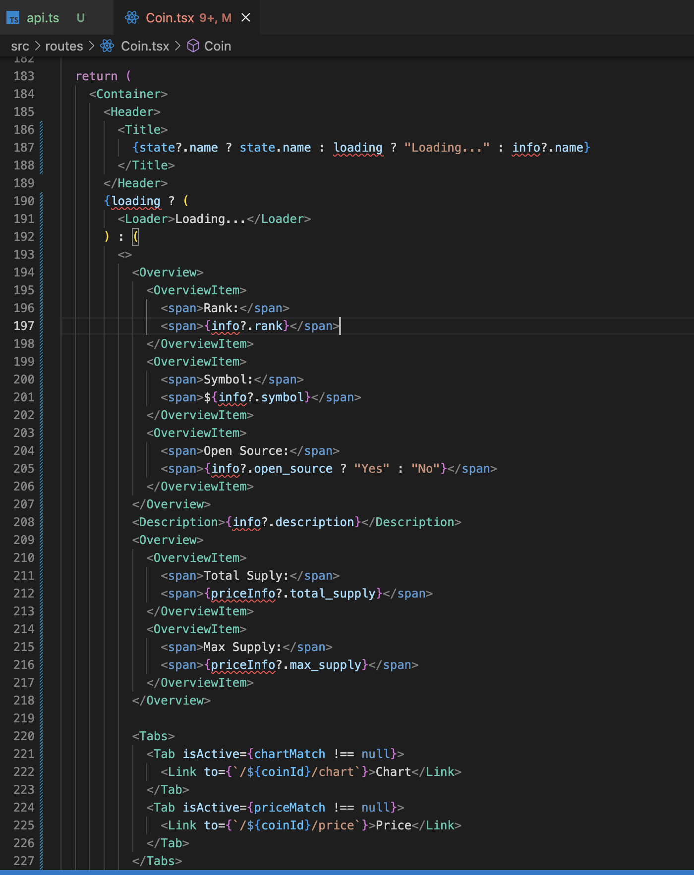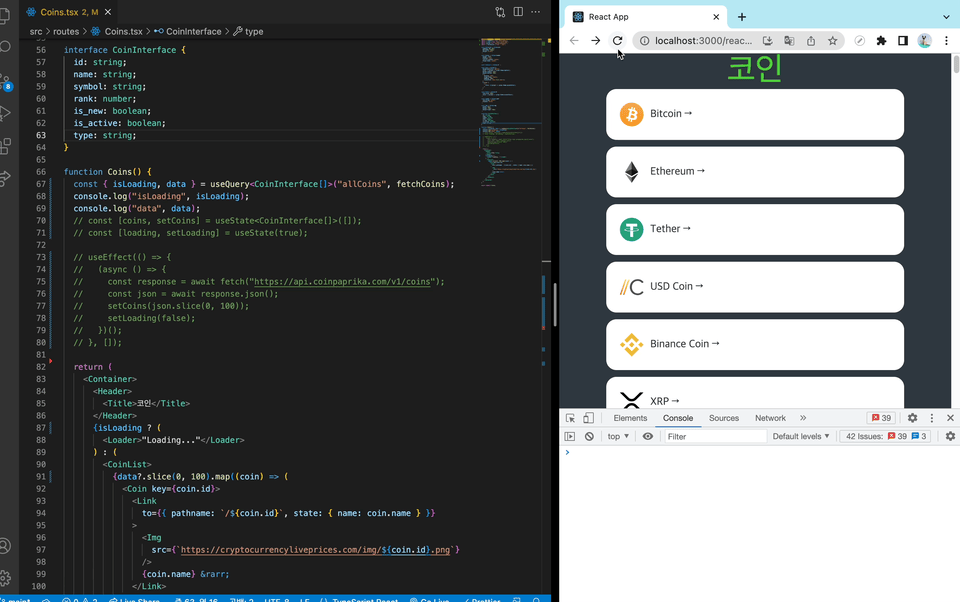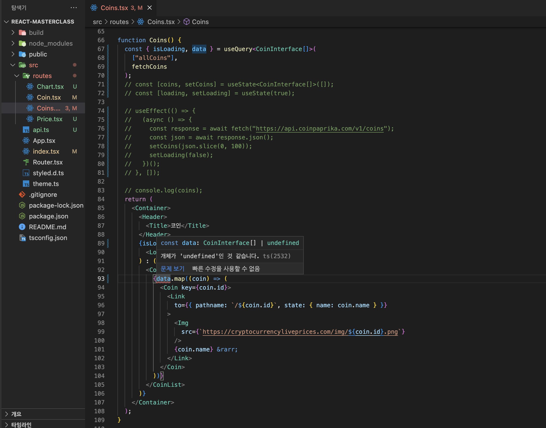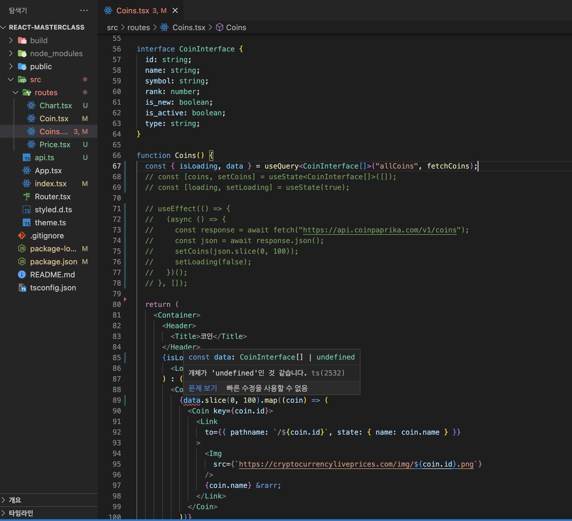 4. 원래 리턴되던 loading state를 useQuery에서 오는isLoading으로 바꾸고, coins state를 data로 바꿔줌. 하지만 타입스크립트는 data가 뭔지 몰라 coin에 오류를 나타냄.
