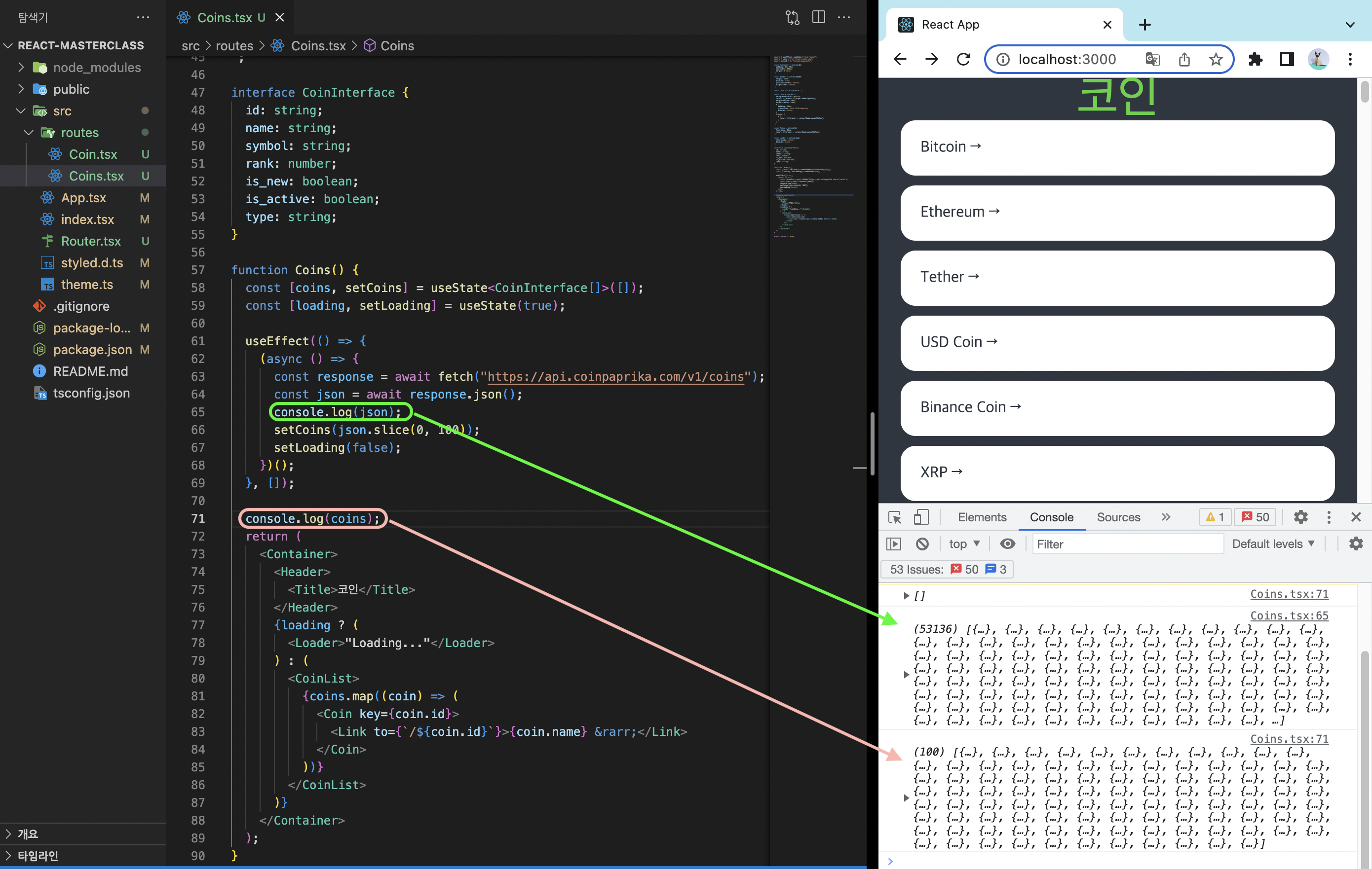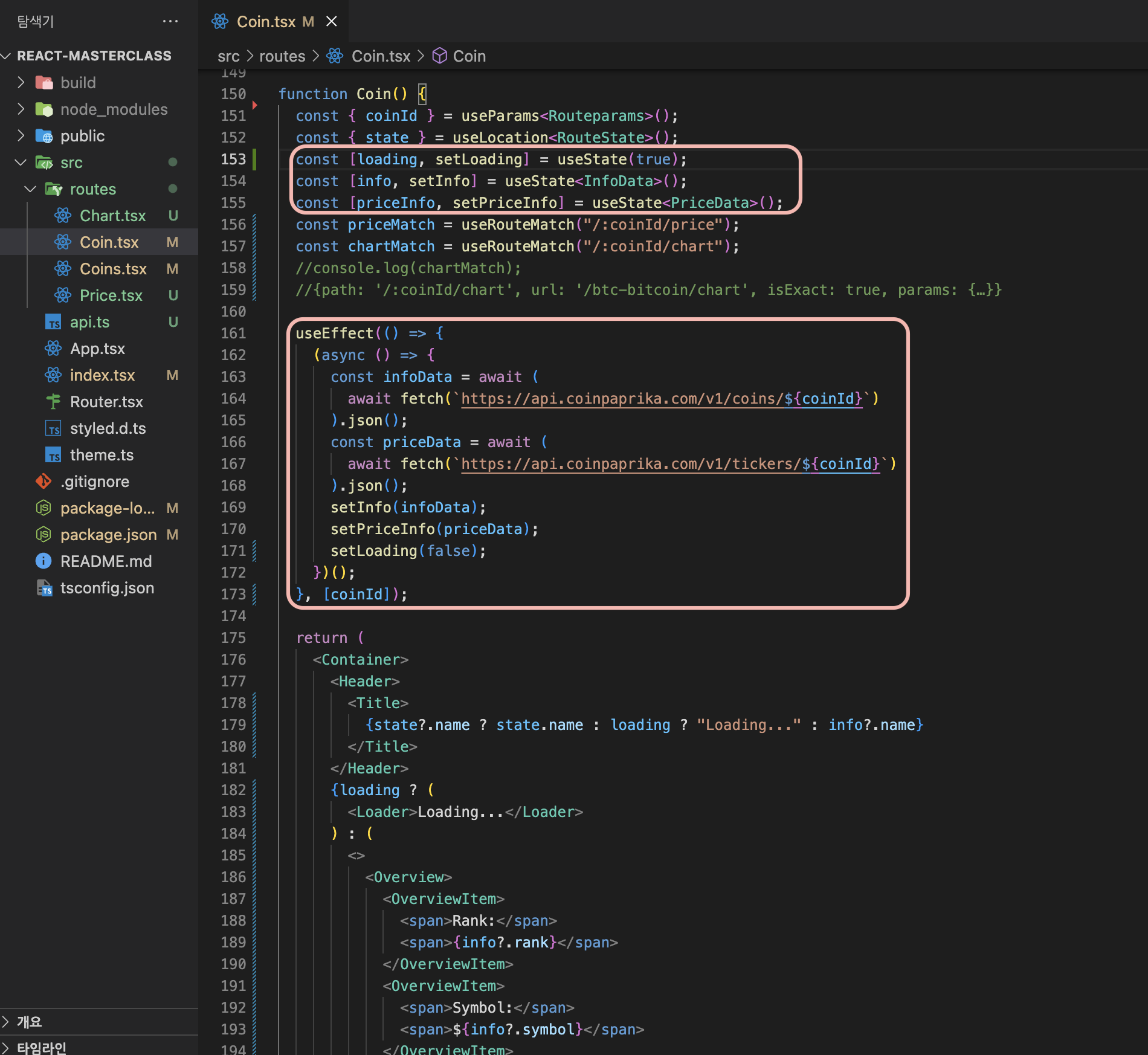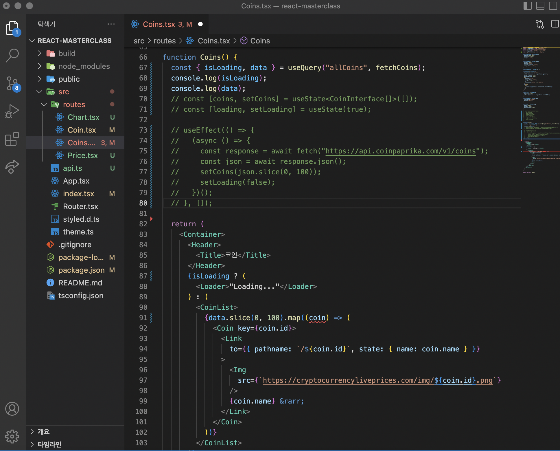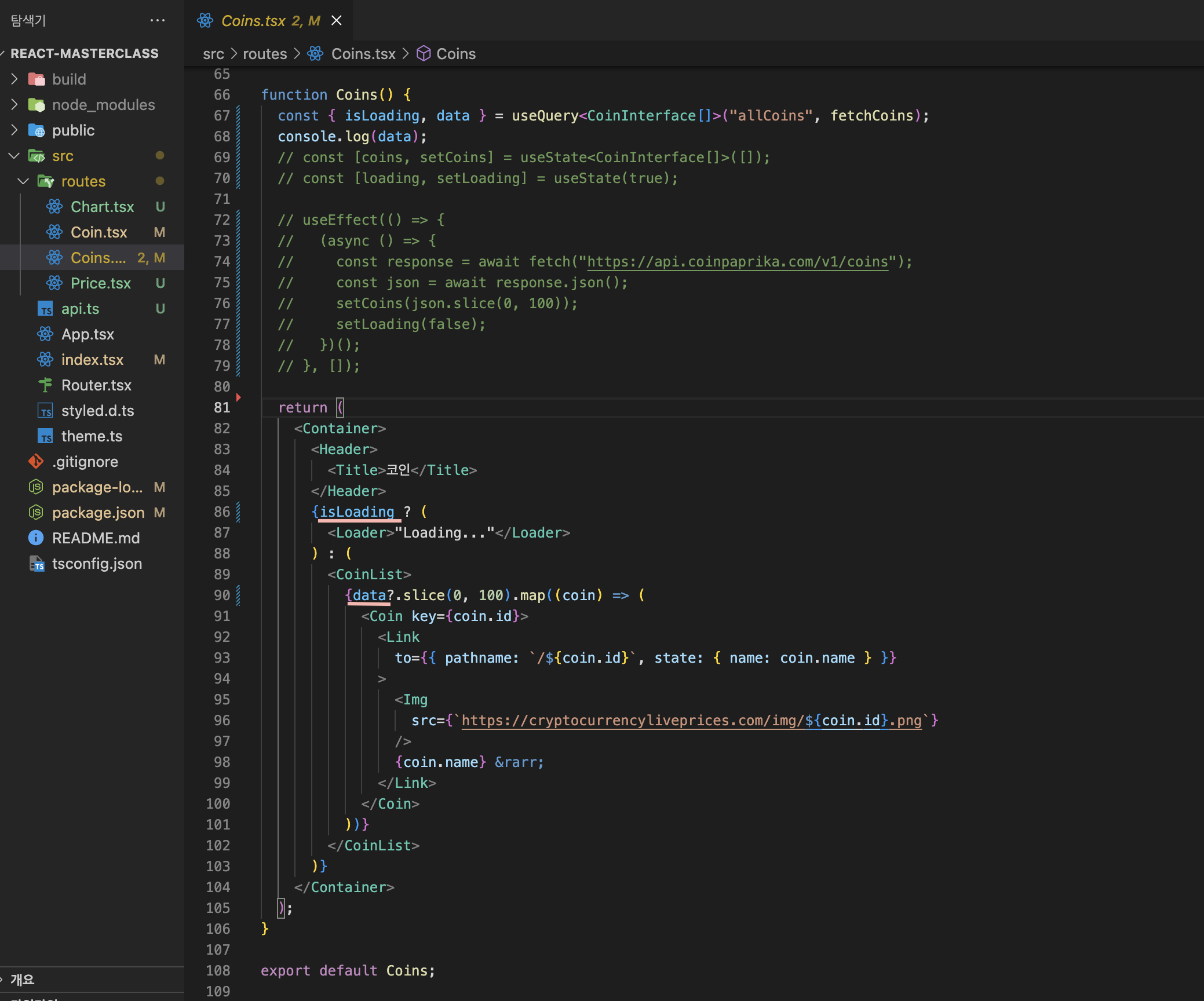 2. coins.tsx에 원래 있던 state와 useEffect를 주석처리하고 react query의 useQuery 훅으로 대체함.