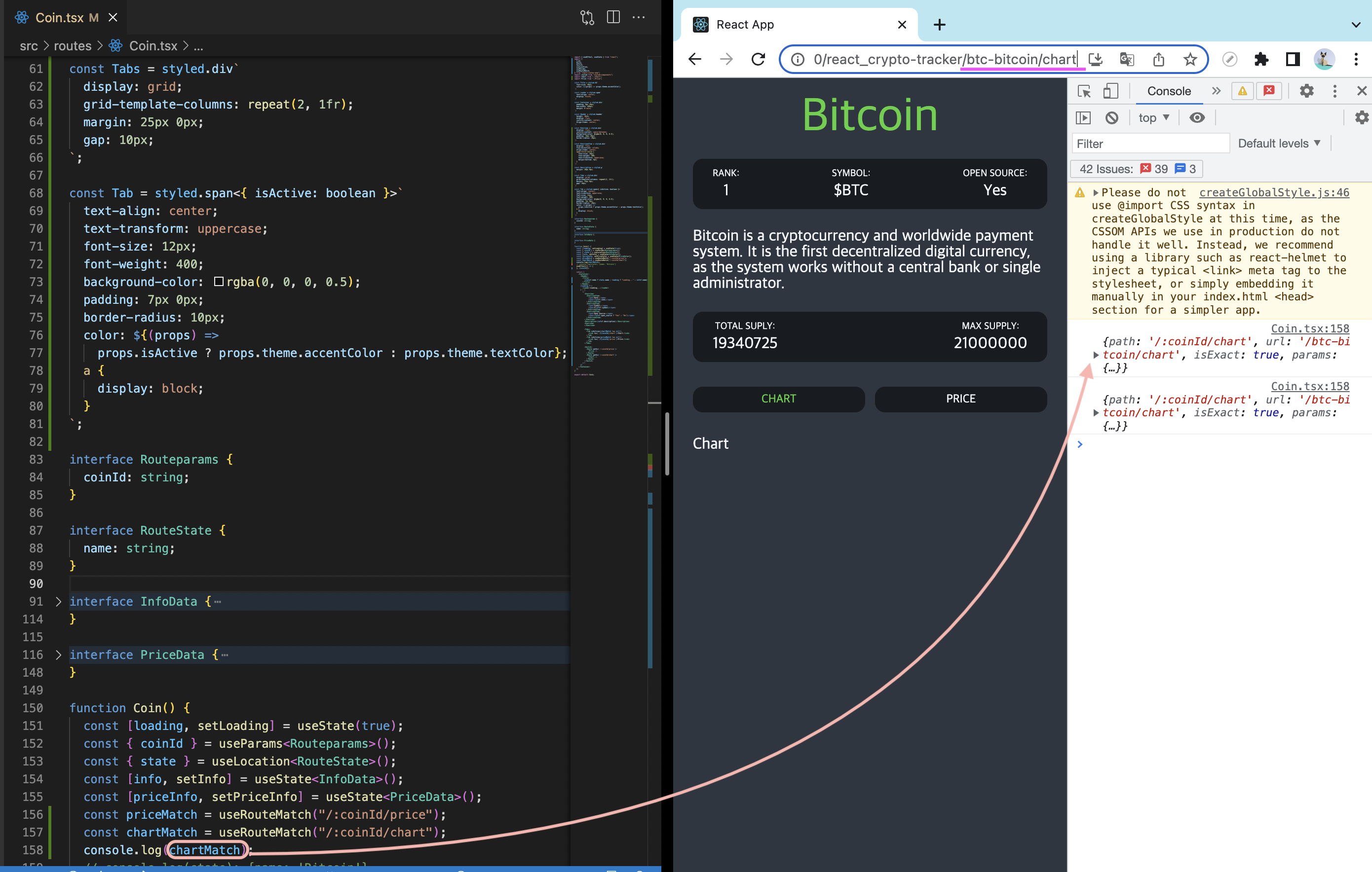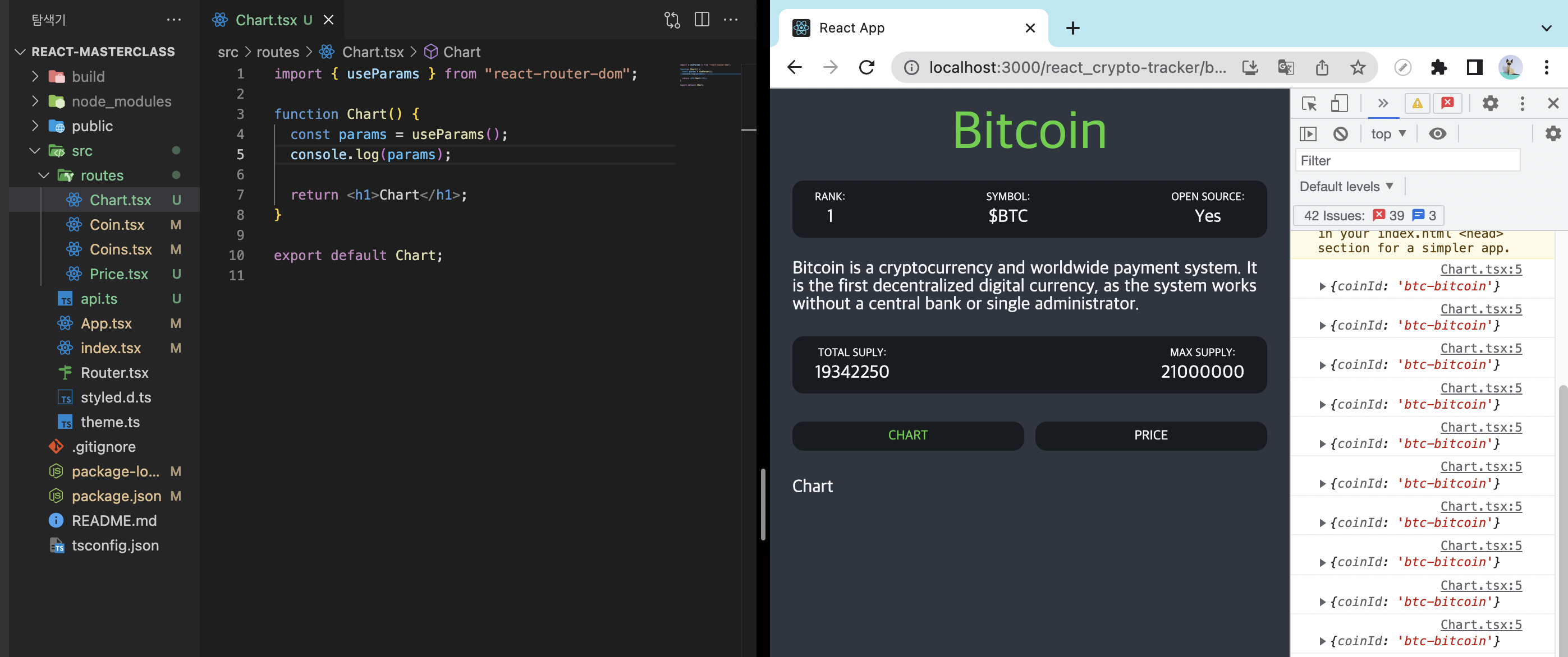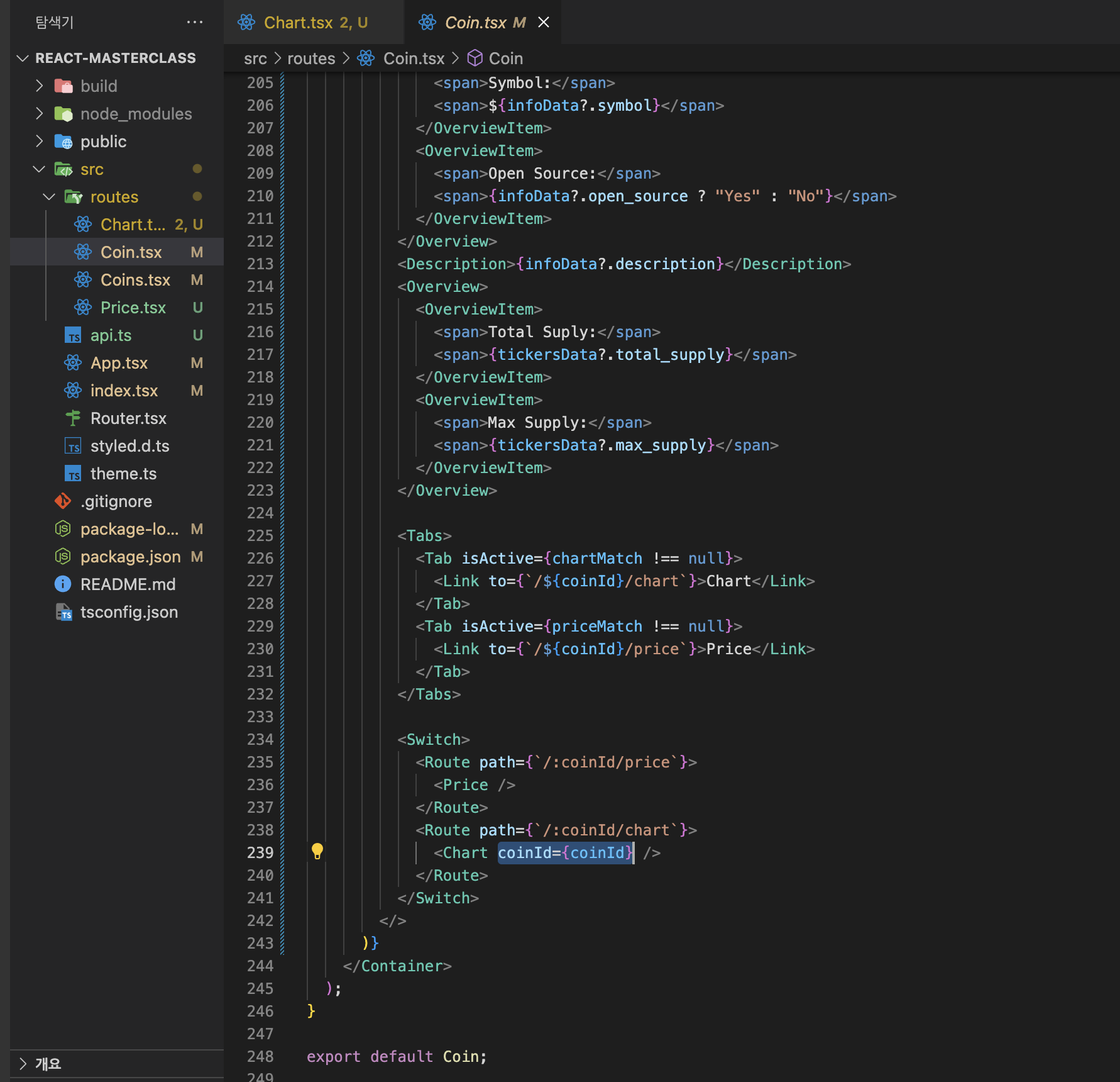 비트코인 페이지에 들어가면 비트코인의 차트를 보여줘야 함. 유저가 보고 있는 암호화폐를 알아내는 2가지 방법이 있는데 하나는 위와같이 useParams()를 사용하는 것임.