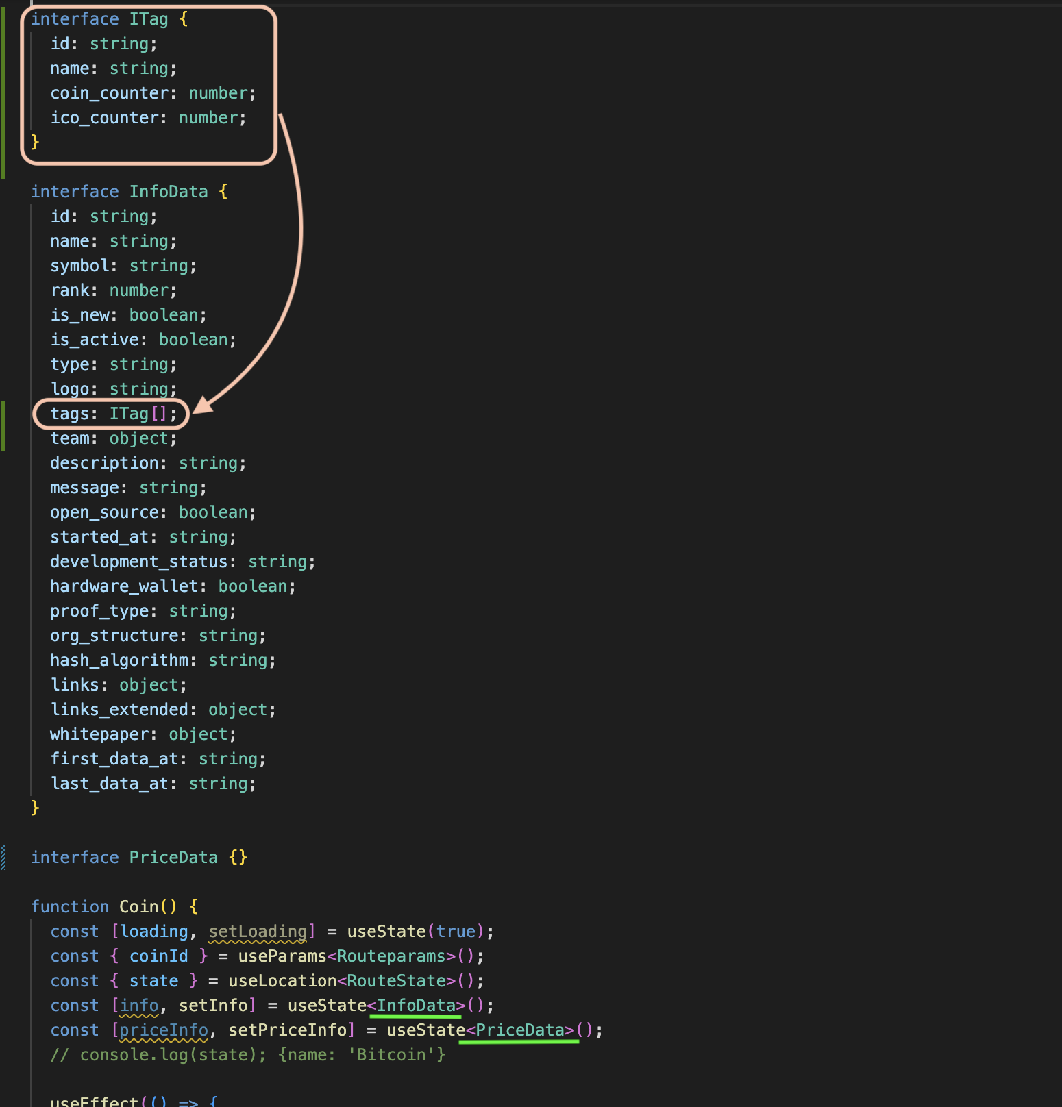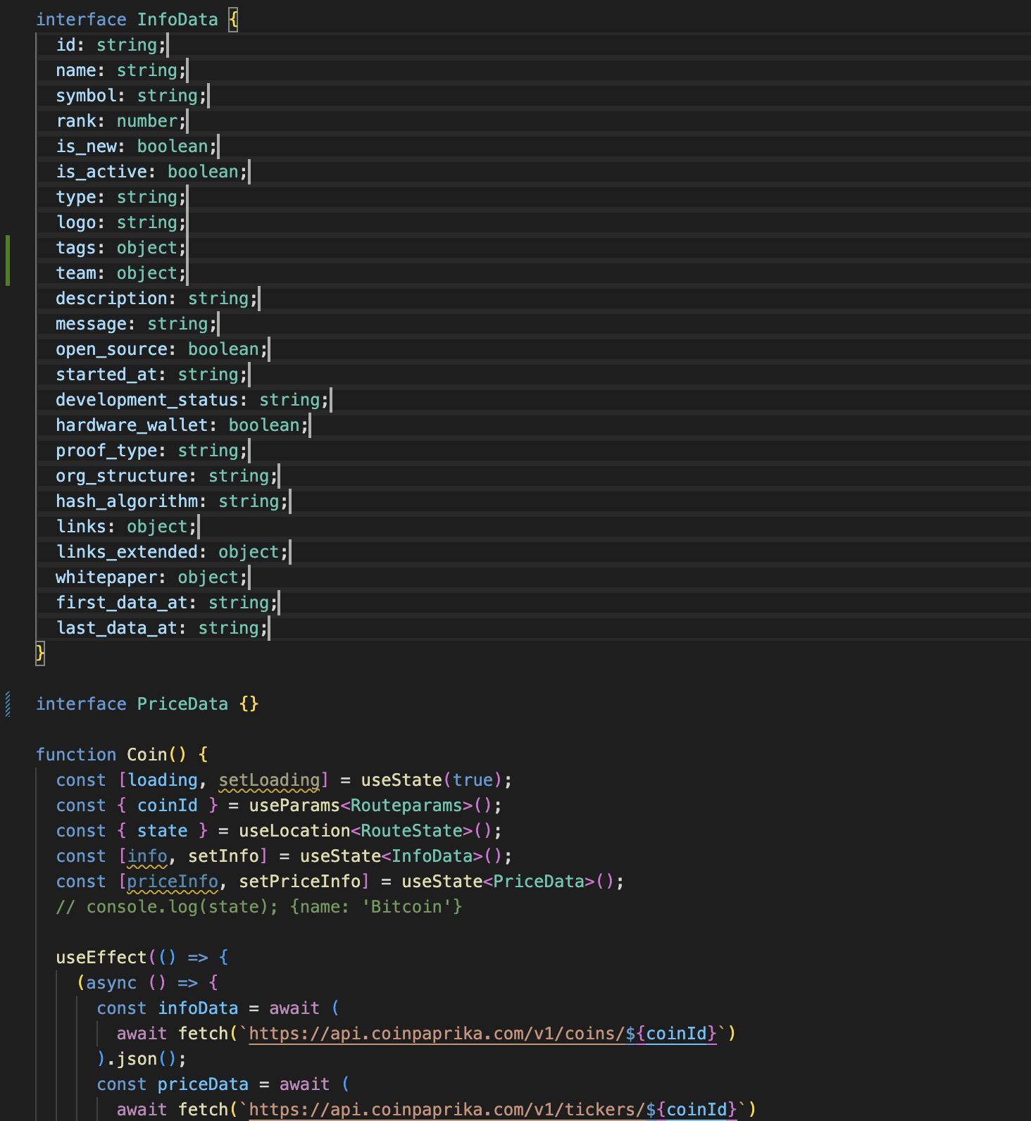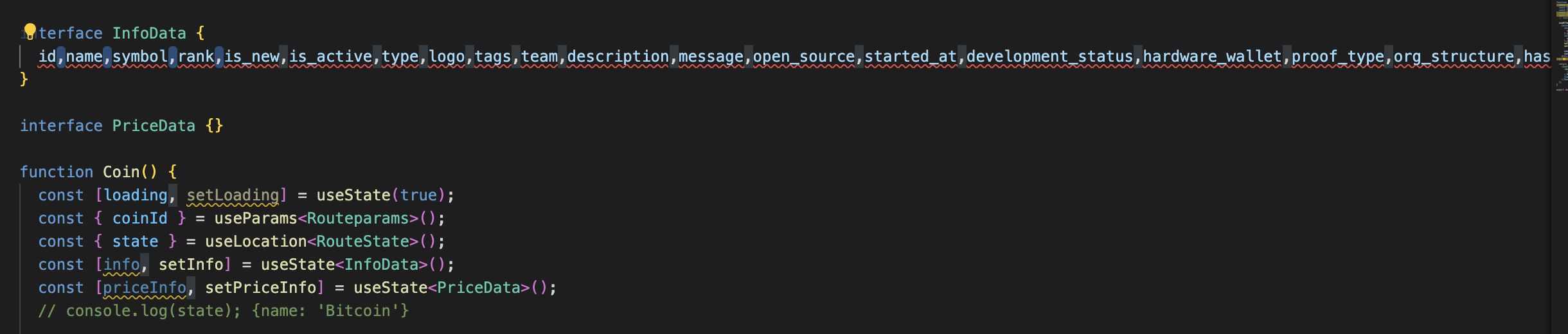 5. 위와 같이 interface로 정의해주면 타입스크립트는 data가 CoinInterface array거나 undefined인걸 알게됨. 위와 같은 오류는 data?로 하면 없어짐.