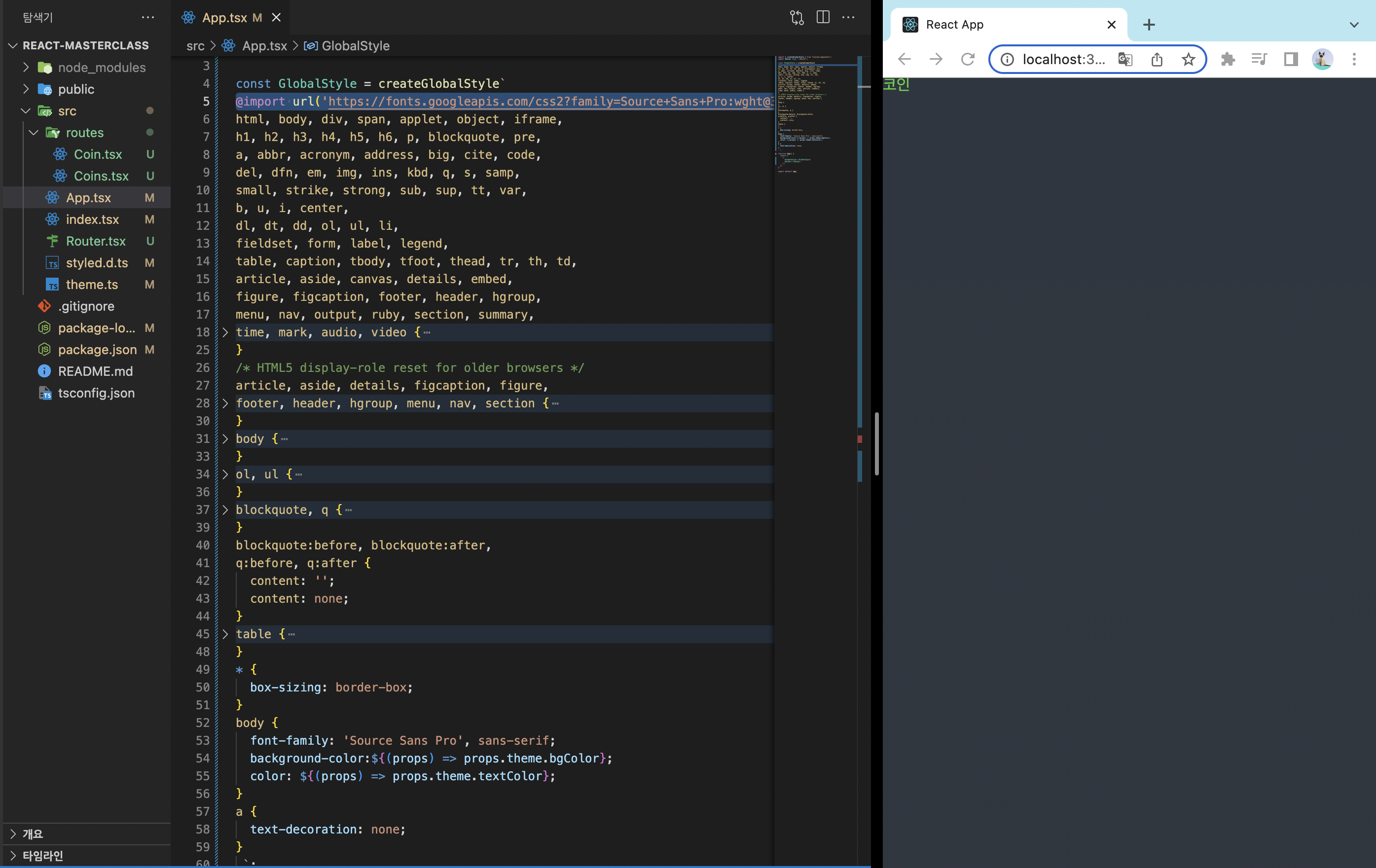 createGlobalStyle이란 프로퍼티를 갖고 있음. <GlobalStyle/>컴포넌트는 렌더링 될 때, 전역 스코프에 스타일들을 적용시켜줌.<> </> : Fragment라고 불리며 일종의 유령 컴포넌트임. 2개의 컴포넌트를 리턴해야 할 때 사용함. 부모 없이 서로 붙어 있는 많은 것들을 리턴할 수 있음.import { createGlobalStyle } from "styled-components";