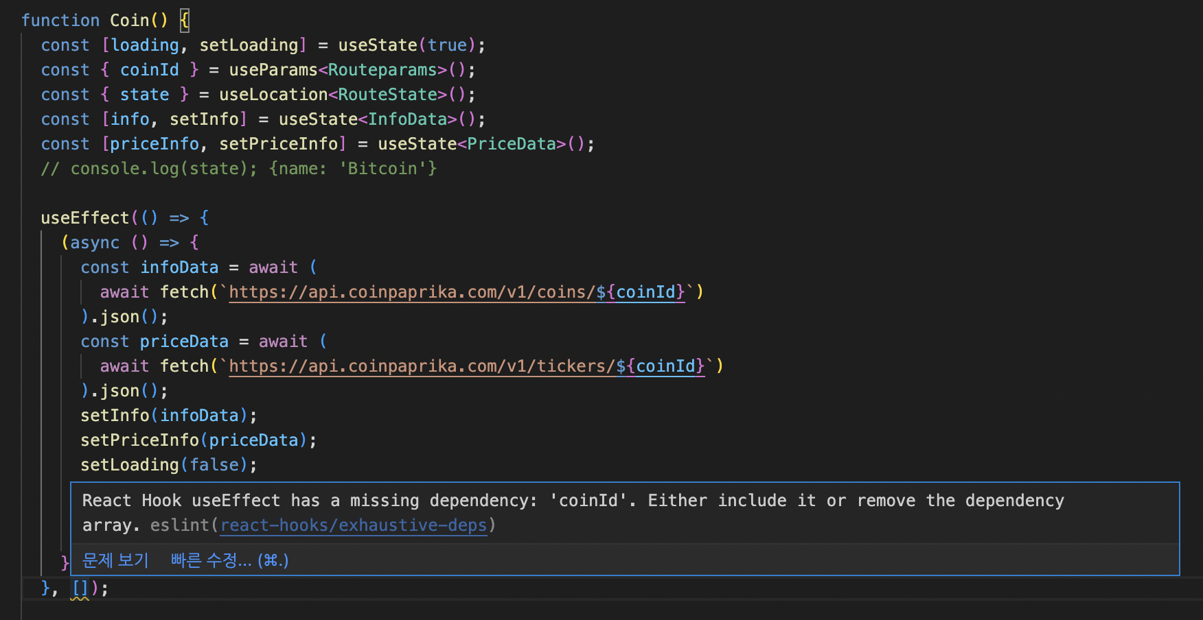 coinId 변수를 추가해주면 경고가 사라짐.no dependencies([])를 사용해야 하는걸 알고 있을거임.coinId라고 불리는 것을 사용하고 있다고 알려주는 거임.coinId가 변하면 동작할텐데, coinId는 url에 위치해서 절대 변하지 않으므로 넣어도 됨.