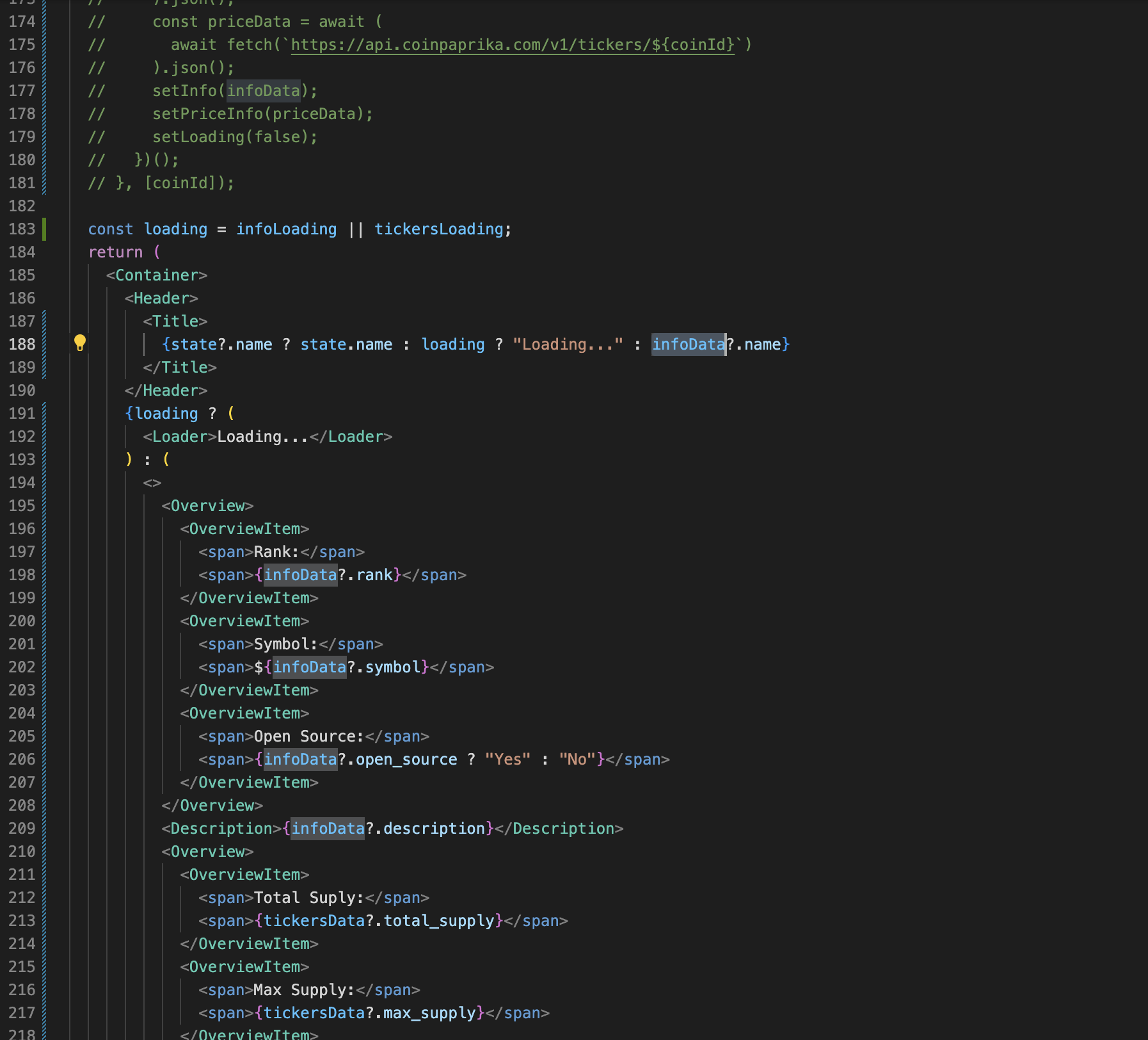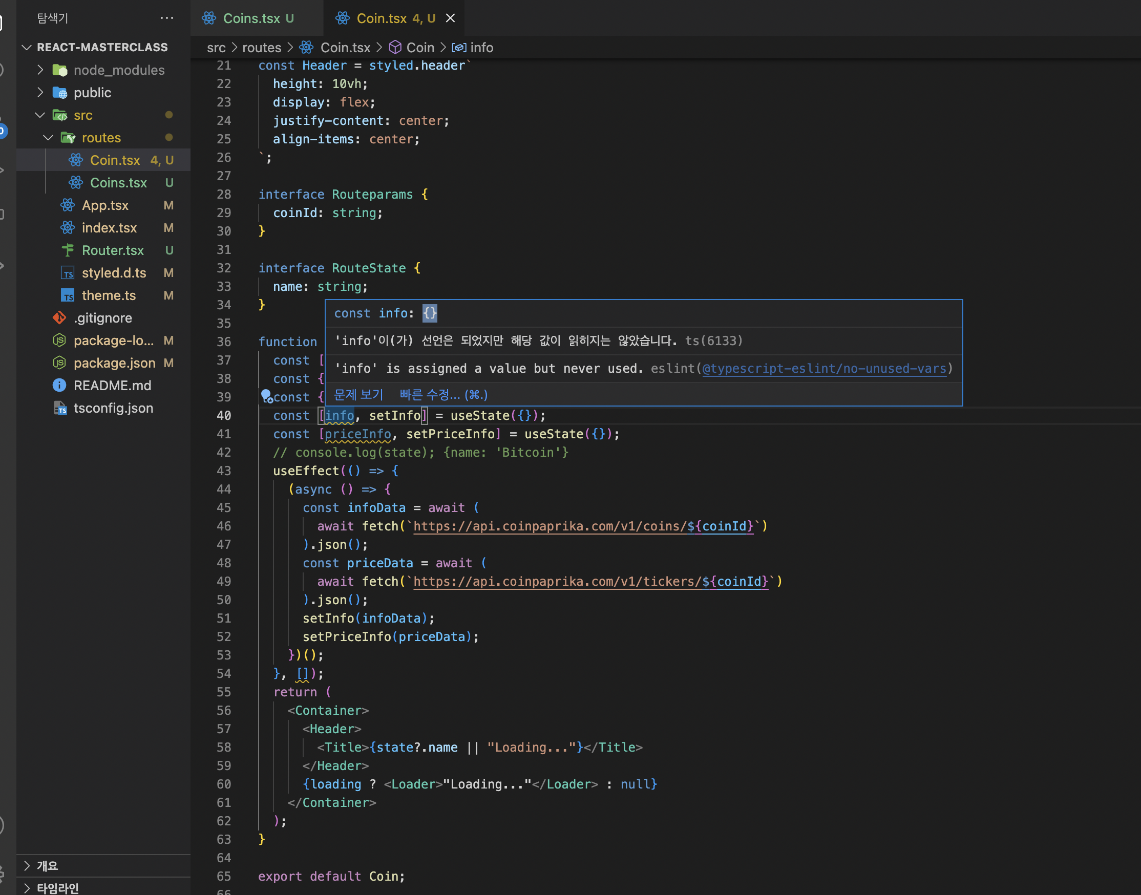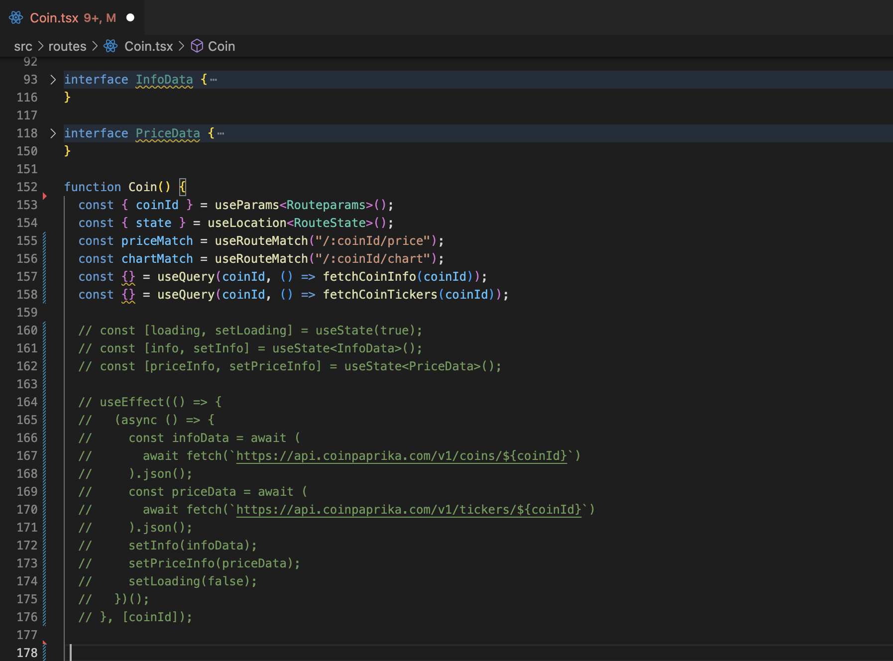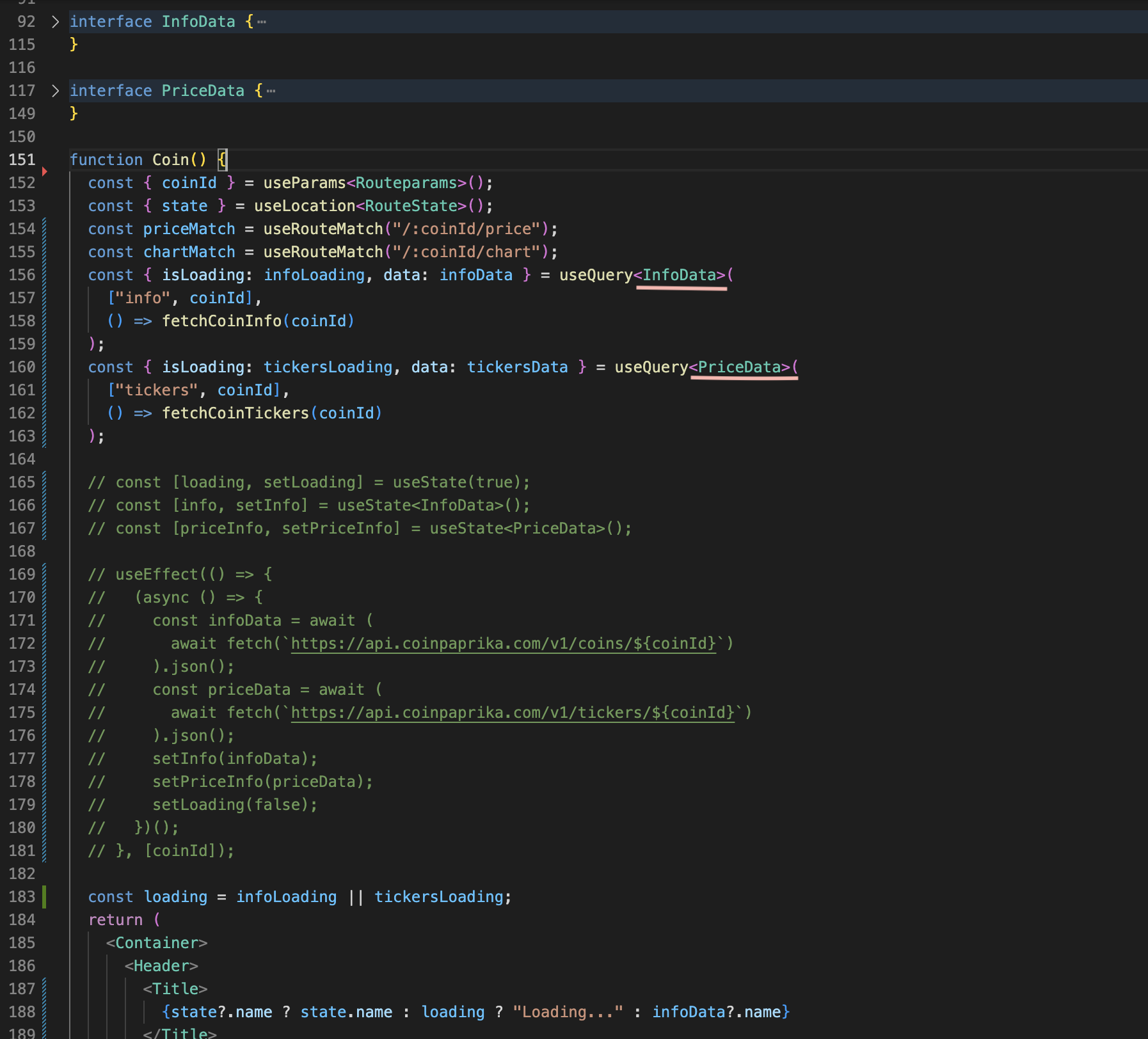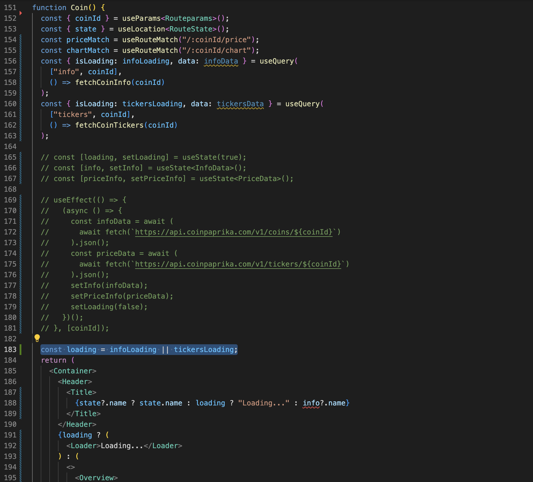 coin.tsx로와서 원래 있던 state들과 fetch들을 주석처리하고 useQuery를 만듦.const {} = useQuery(["info",coinId], () => fetchCoinInfo(coinId));