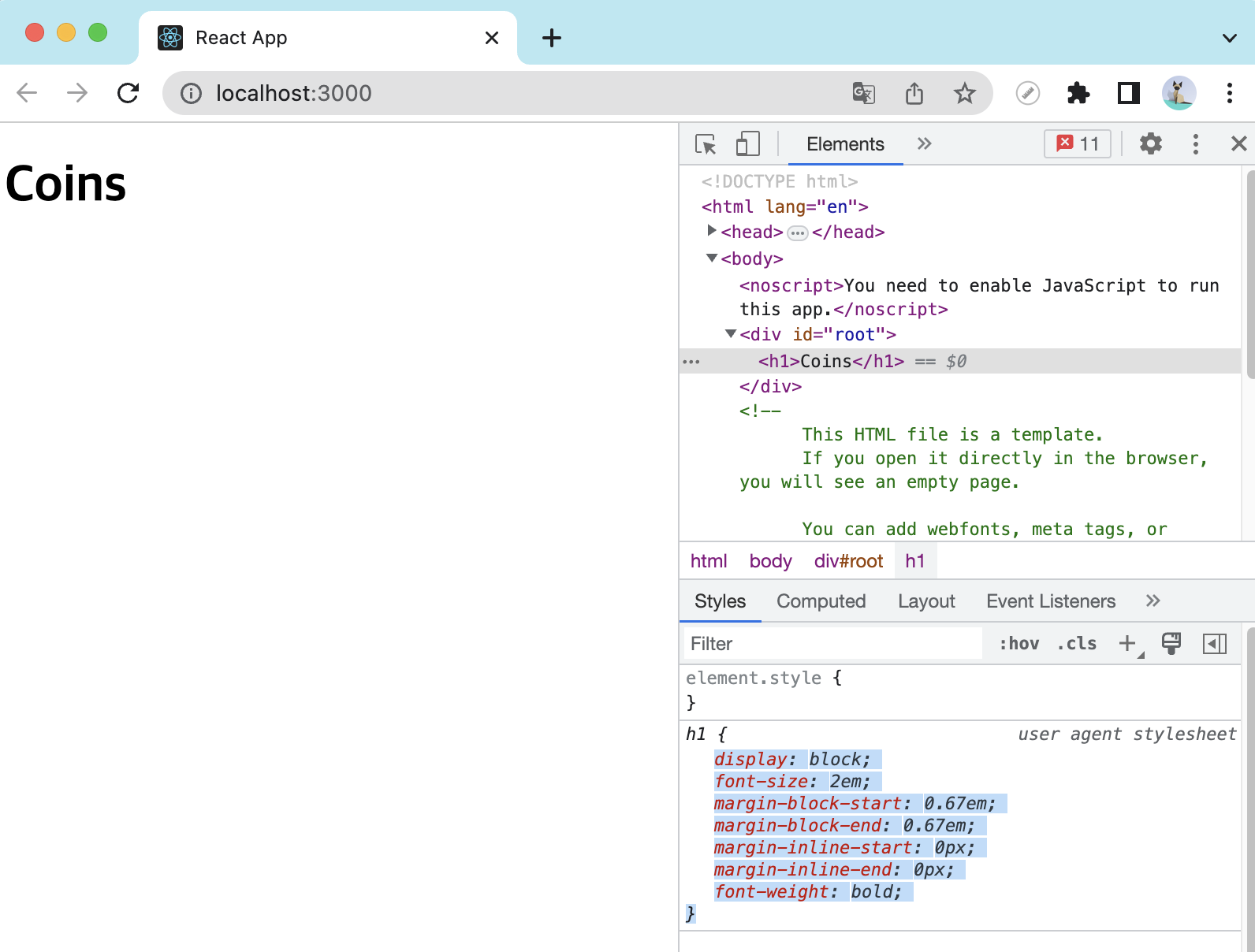 이번엔 CSS set up을 해보자. 아무것도 건들지 않은 CSS는 위와 같이 브라우저의 기본 스타일을 가지고 있는데 (h1이 기본 font-size를 가지거나 List가 padding을 가지는것 등등) 이걸 다 없앨 거임.