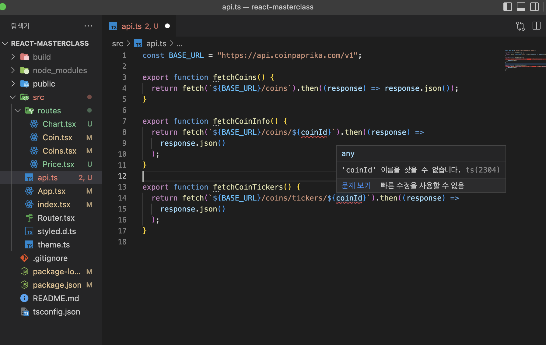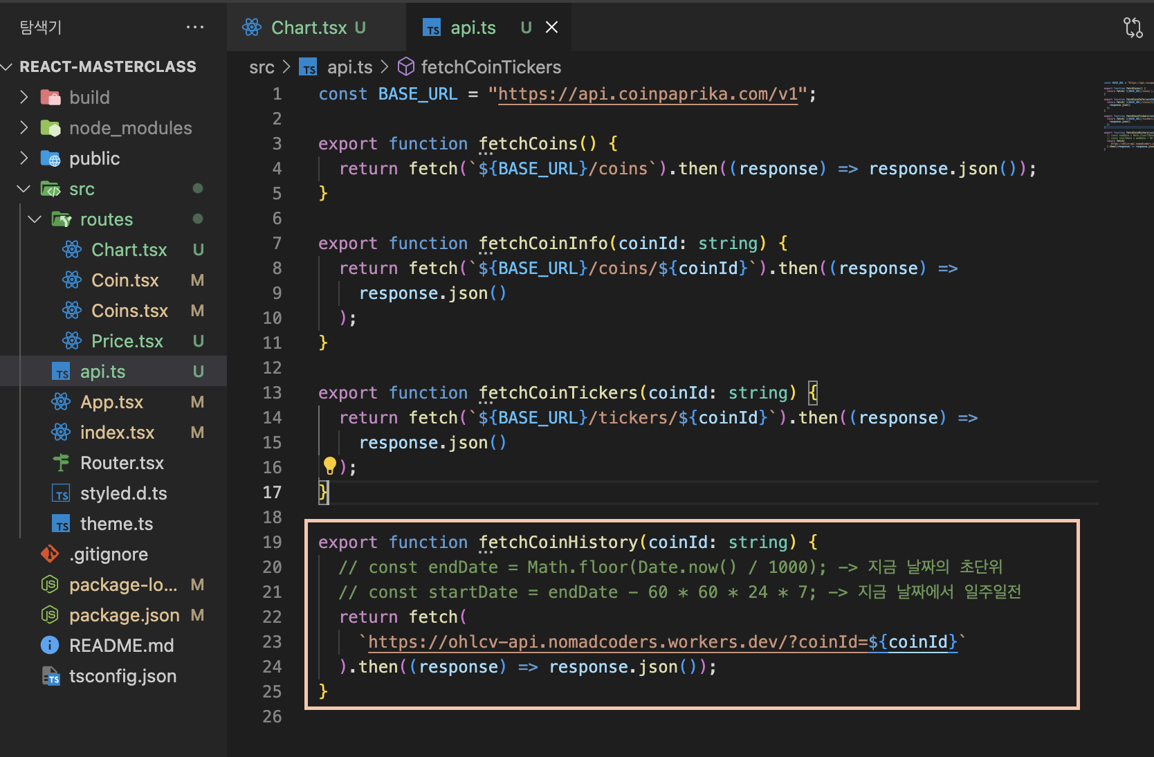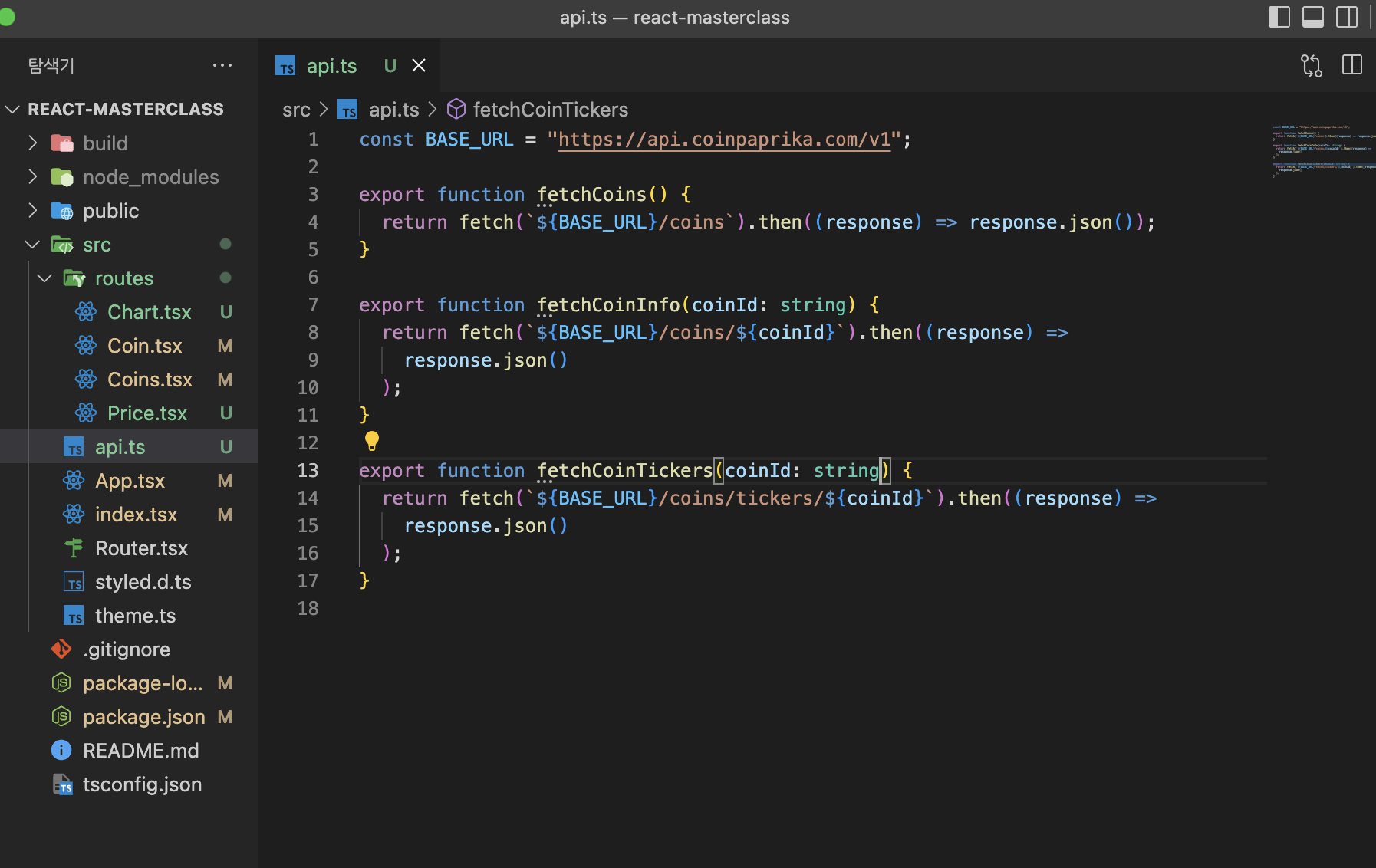 1. 먼저 데이터를 fetch하는 fetcher 함수가 필요한데, API와 관련된 것들은 component들과 멀리 떨어져 있는게 좋으니 src/api.ts 파일을 만들어서 fetcher 함수를 만들어줌.