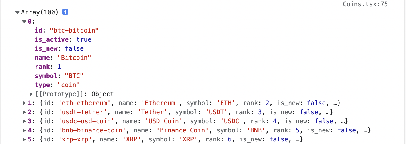 loading과 info는 각각 로딩과 데이터를 위한 state임. 그리고 데이터가 준비되면 데이터를 state에 넣고 로딩은 false넣는 과정을 우리 스스로 했음. react query는 이 모든 과정을 자동으로 해줄 거임!coins.tsx (홈페이지)